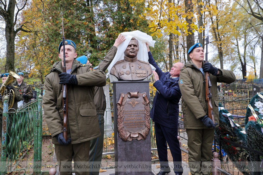 24 октября/ "Витьбичи" / Виталий Сеньков /. На Старо-Семёновском кладбище в Витебске, где похоронен советский военачальник Михаил Иванович Денисенко, состоялась церемония открытия бюста, установленного на могиле героя.