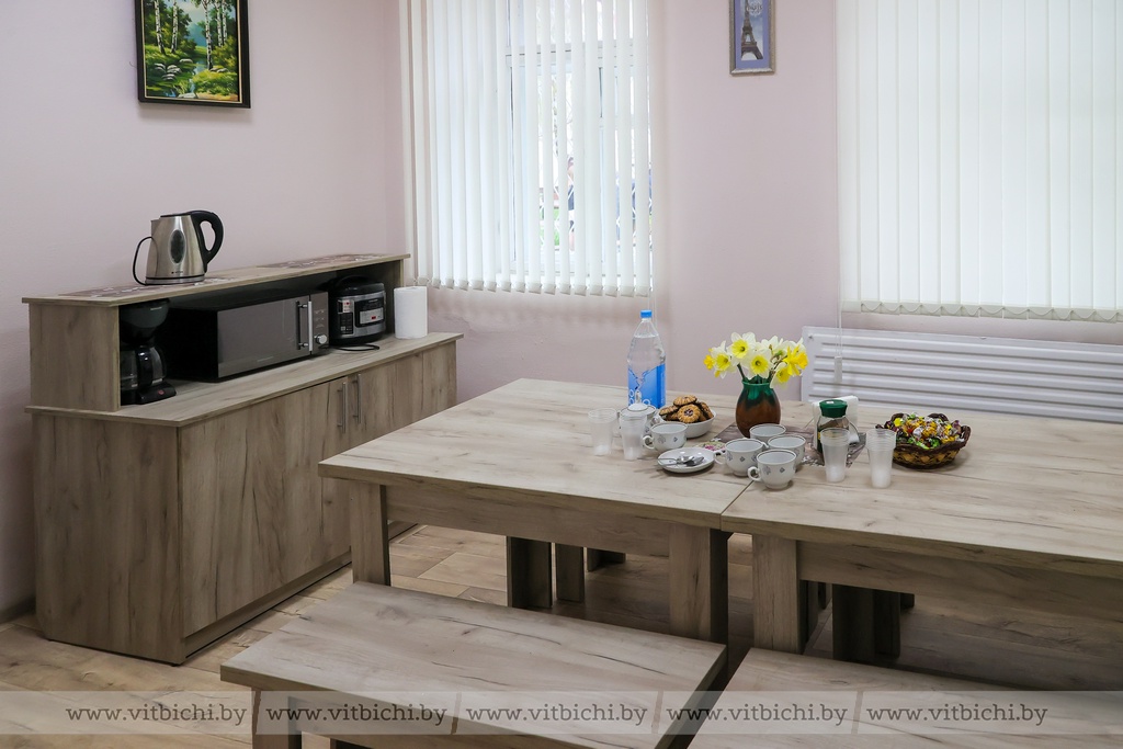 Новые скамейки, ярко покрашенный фасад, на клумбах — цветы. Внутри в помещениях заменили двери, напольное покрытие, сантехническое оборудование. Привели в надлежащий вид душевую и санитарную комнаты. Обновили мебель для столовой, закупили шкафчики для работников.