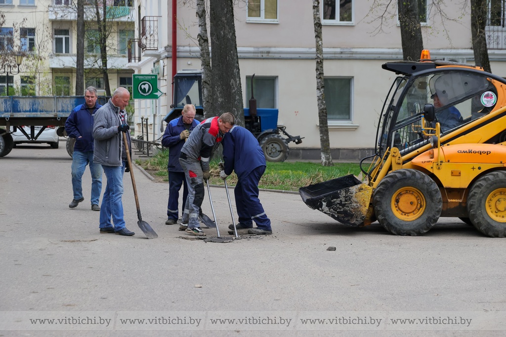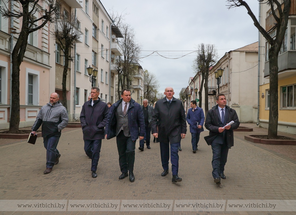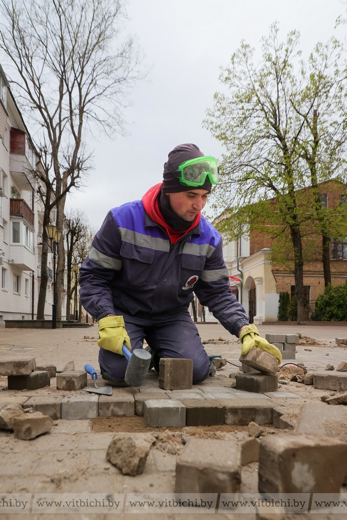 Председатель горисполкома осмотрел места точечного ремонта тротуарной плитки на улице Суворова. Поговорил с рабочими. Например, Павел Семёнов из строительной службы Витебскгаза признался, что очень рад помогать благоустраивать родной город.