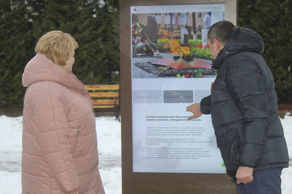 На праздновании 80-й годовщины освобождения Городка и Городокского района от немецко-фашистских захватчиков председатель облисполкома Александр Субботин и председатель Городокского райисполкома Ирина Полякова торжественно открыли уникальный не имеющий аналогов в Беларуси электронный инфокиоск «Автоматизированная база данных «Книга «Память» Городокского района». Установлен он у ворот мемориального комплекса «Бессмертие и по внешнему виду напоминает увеличенный во много раз планшет.