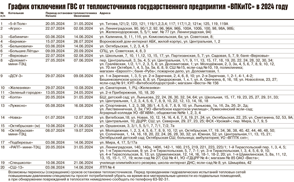 График отключения горячего водоснабжения от теплоисточников государственного предприятия «ВПКиТС» в 2024 году