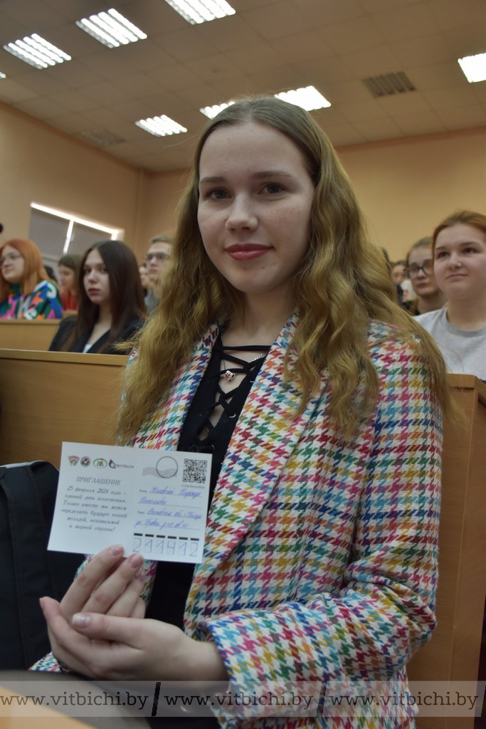 После диалоговой площадки все желающие приняли участие в молодежном информационно-просветительском проекте «Паштоўка.БЕЛ» Студенты заполнили пригласительную открытку с напоминанием о едином дне голосования и опустили ее в почтовый ящик БРСМ. Такое именное приглашение от Вячеслава Дурнова получила отличница учебы, студентка 2 курса лечебного факультета Надежда Жаховская.