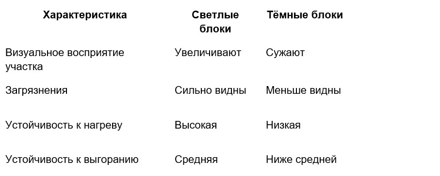Светлые блоки визуально расширяют участок, но требуют регулярного ухода, так как быстрее показывают следы грязи. Тёмные оттенки более практичны: на них меньше заметны загрязнения, однако на солнце они сильнее нагреваются и могут быстрее выгорать.