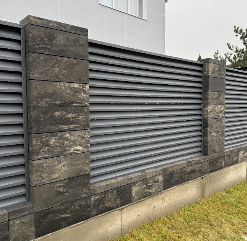 Часто используют комбинацию основного и акцентного ряда. Например, тёмный цоколь и более светлые верхние блоки. Популярны декоративные Блоки для забора "Мрамор", которые можно сочетать с серыми или белыми модулями.