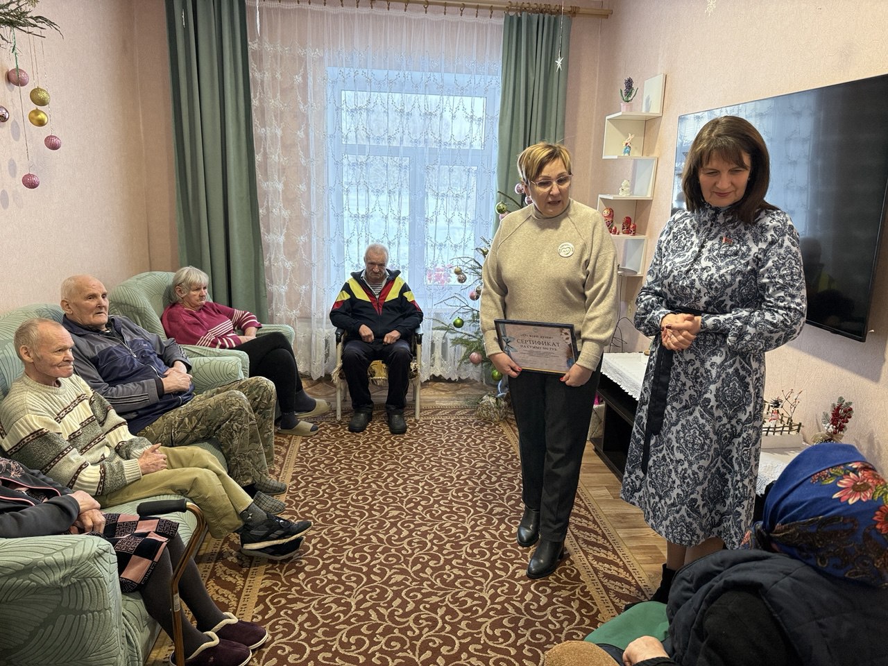 В рамках акции «От всей души» глава областного объединения профсоюзов вручила сертификат на укрепление материально-технической базы территориального центра. Средства, в частности, будут направлены на обновление интерьера в отделении круглосуточного пребывания для граждан пожилого возраста и инвалидов в агрогородке Богданово. В этом специализированном отделении обслуживают одиноких пенсионеров, людей с инвалидностью. Сейчас в нем проживают 30 человек, самому старшему из них 96 лет.