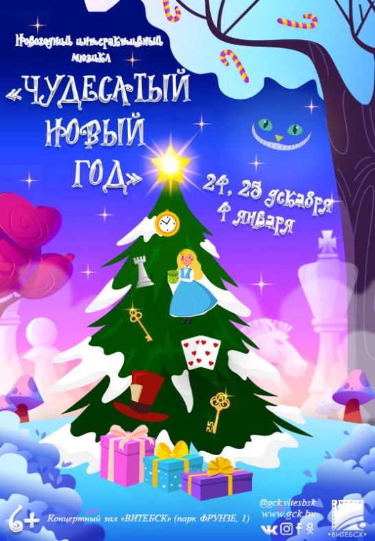 Мы представили и претворили в жизнь интерактивный мюзикл «ЧУДЕСАТЫЙ НОВЫЙ ГОД». Это современная история оказавшейся в стране чудес Алисы из сказки Льюиса Кэрролла. Среди персонажей, которые ей составят компанию, - Шляпник, Чеширский Кот, Синяя Гусеница, Мартовский Кролик, Дед Мороз. Новогоднее представление обещает также заворожить зрителя волшебной музыкой, изысканными нарядами и декорациями. Дополнят праздничную программу выступления творческих коллективов города и Центра культуры "Витебск».