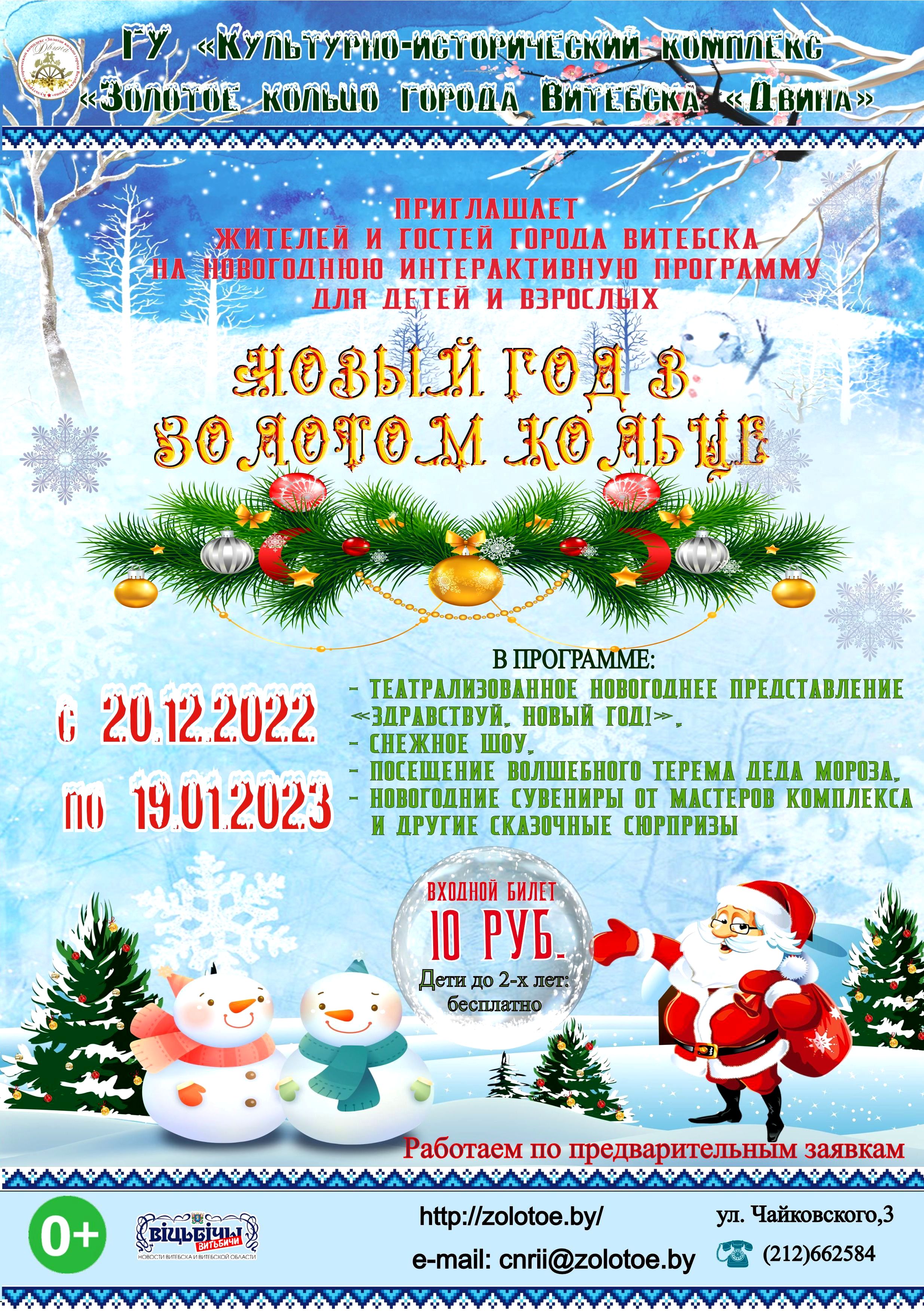 Культурно-исторический комплекс «Золотое кольцо города Витебска «Двина»»Жителей и гостей города Витебска приглашает с 20 декабря 2022 года по 19 января 2023 года на новогоднюю программу для детей и взрослых. Вас ждет театрализованное представление «Здравствуй, Новый год!», снежное шоу, посещение волшебного терема Деда Мороза, новогодние сувениры от мастеров комплекса и другие сказочные сюрпризы.