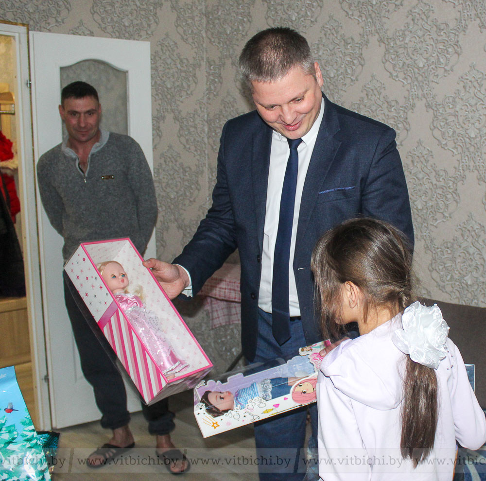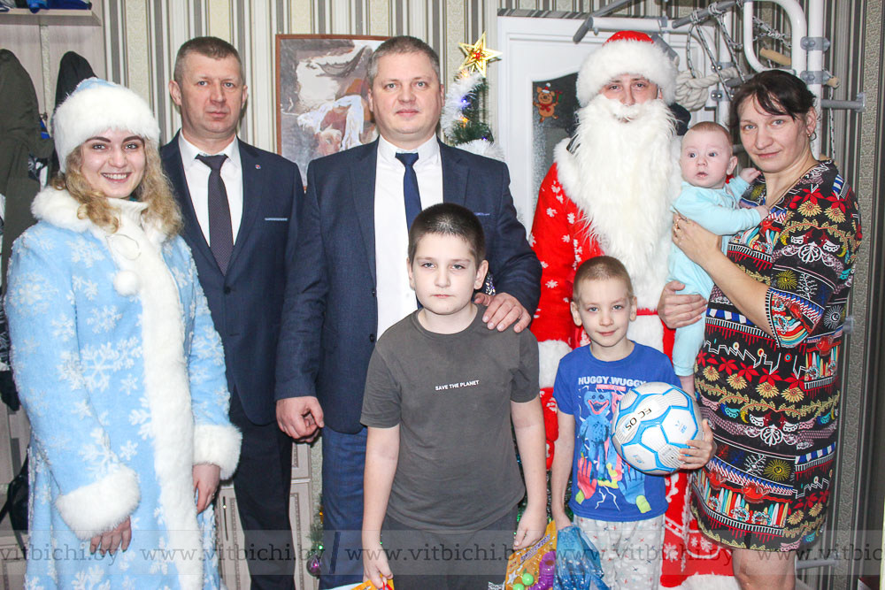 В гостеприимный дом многодетной мамы Елены Кравцовой отправились с подарками глава администрации Железнодорожного района Алексей Героев, начальник отдела по образованию, спорта и туризма Анжелика Михайлова и заместитель директора Витебского филиала республиканского унитарного предприятия по оказанию услуг «БелЮрОбеспечение» Вадим Ильинец.