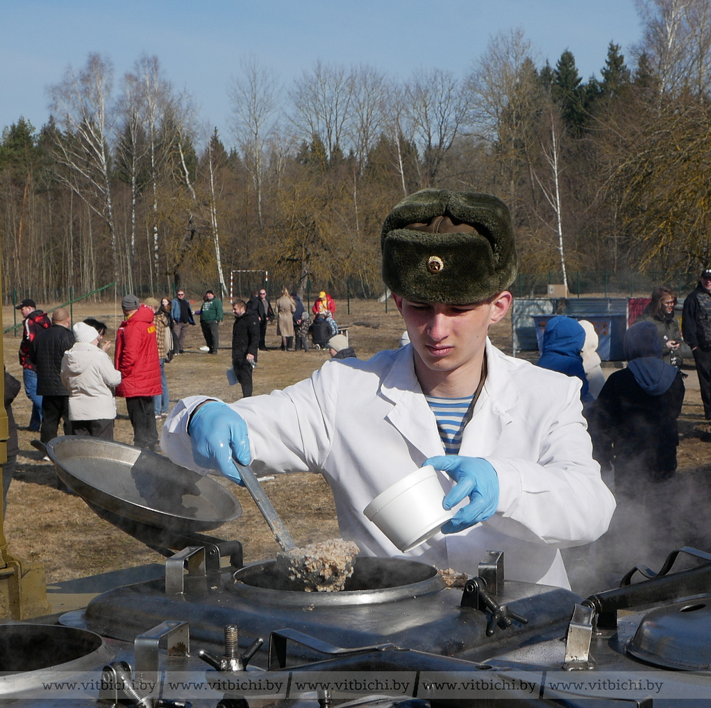 Военнослужащие угощали солдатской кашей и чаем.