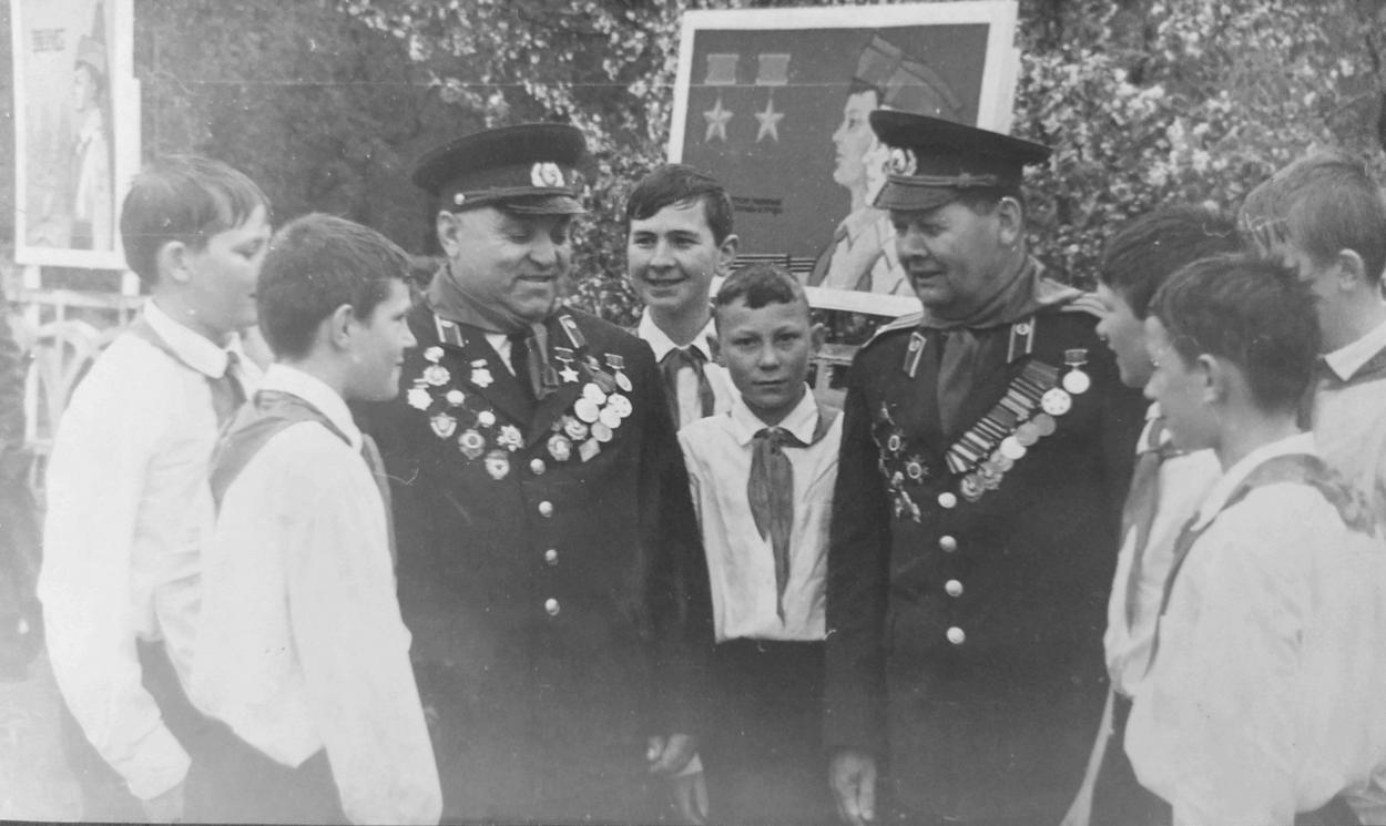 Михаил Маскаев (слева) на встрече с пионерами в Бийске.