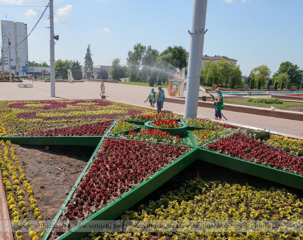 На площади Победы в Витебске появились новые инсталляции в виде пятиконечной звезды. Только на одну композицию ушло около 2 тысяч цветов.