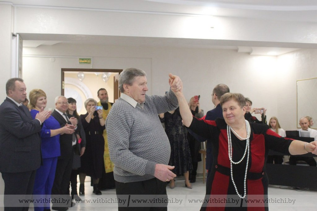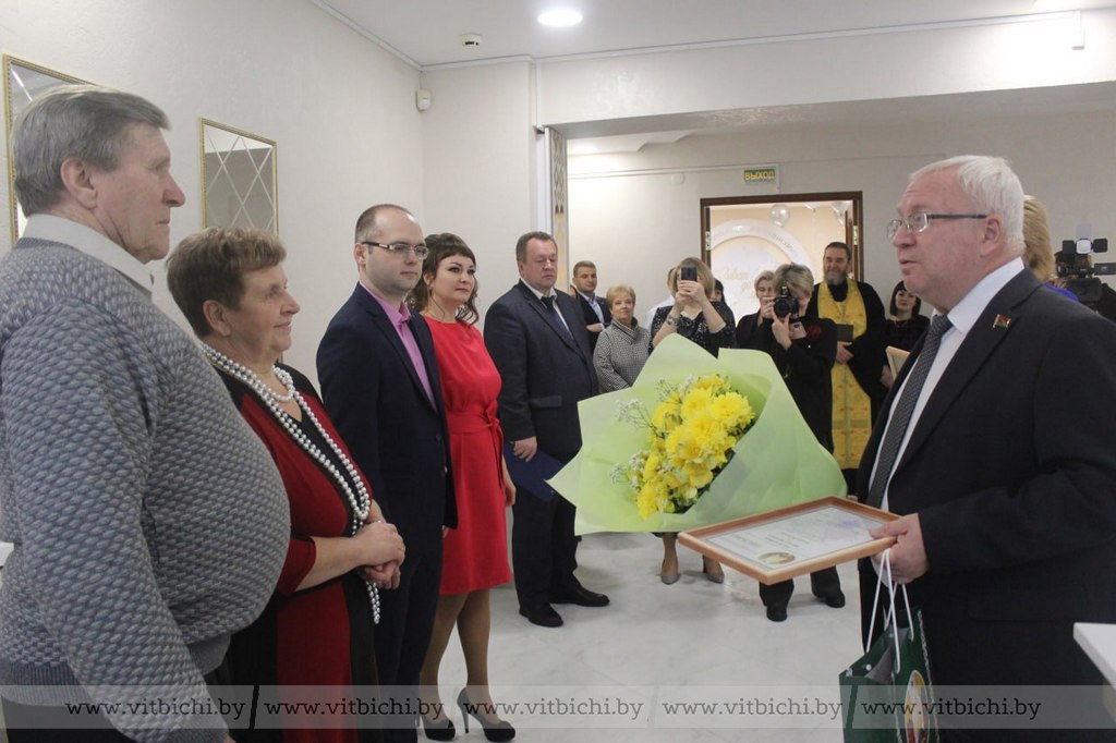 Супругов, отметивших золотую и розовую свадьбы, поздравляли не только их родные и близкие. Председатель областного Совета депутатов Владимир Терентьев и председатель Городокского райисполкома Ирина Полякова вручили семейным парам роскошные букеты, их цветовая гамма совпадала с названиями свадебных юбилеев. Владимир Терентьев подчеркнул, что обновленный зал для бракосочетаний и других торжественных обрядов открылся как раз вовремя: в год 80-летия освобождения Городокского района от немецко-фашистских захватчиков. Это символ того, что на городокской земле всегда будут звенеть свадьбы и рождаться малыши.