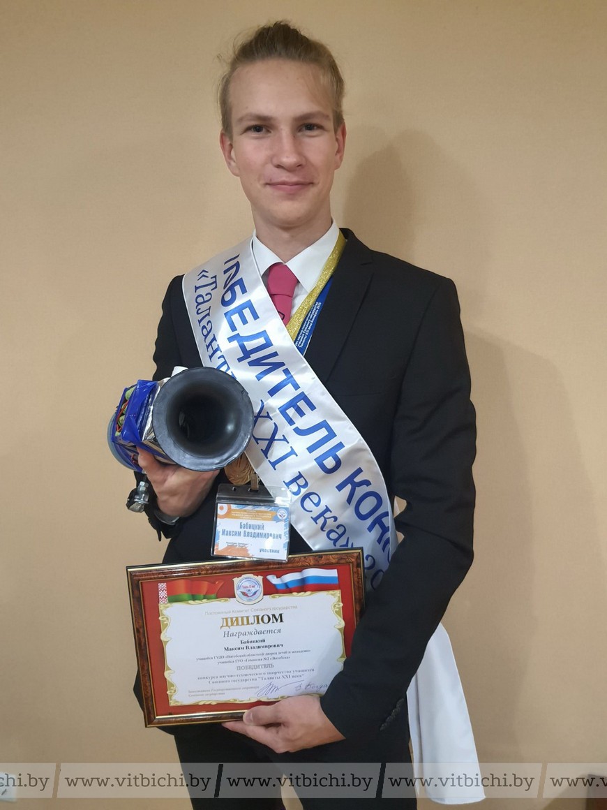 Одиннадцатиклассник витебской гимназии № 2 Максим Бабицкий стал обладателем Гран-при конкурса научно-технического творчества учащихся Союзного государства «Таланты ХХI века». В конкурсе приняло участие около 300 юных изобретателей, рационализаторов, исследователей в возрасте 14-18 лет из Беларуси и России.