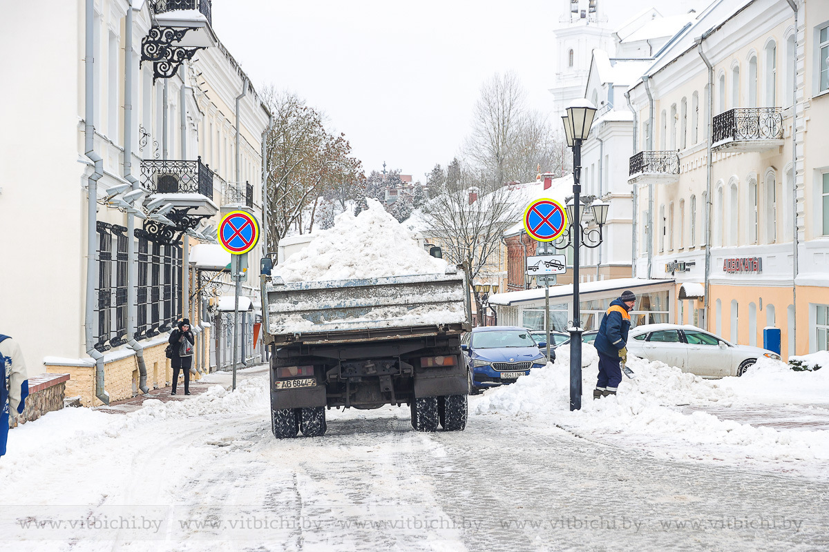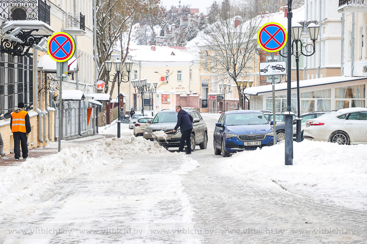Прогулка по пешеходной улице Толстого в очередной раз показала, что никакая она не пешеходная: у офисов были припаркованы более десятка авто. Конечно, это мешало расчистке этого любимого среди витебчан и гостей города места для прогулок.