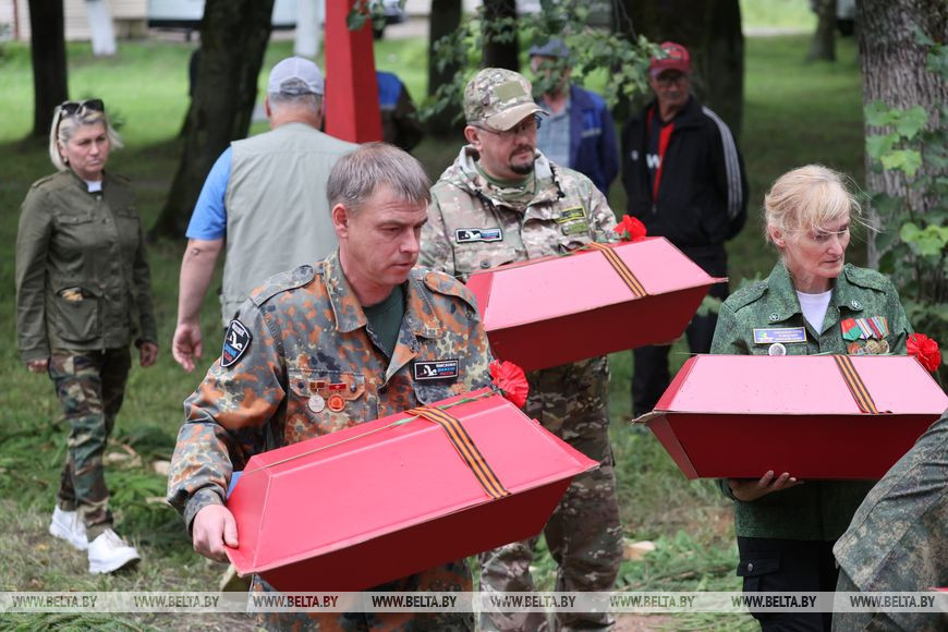 Найденные в лесном массиве в Витебском районе останки бойцов Красной армии, погибших в годы Великой Отечественной войны, с почестями перезахоронили 28 июля в братской могиле в агрогородке Вороны.