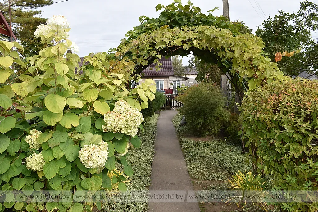 Со всеми растениями Мария Нарожная разговаривает, как с детьми. Может, поэтому даже в октябре они ее по-прежнему радуют, откликаются так на заботу и душевное тепло хозяйки. На относительно небольшой площади гармонично сочетаются абсолютно разные растения: алиссум и георгины, барвинок вариегатный и японская ива Хакуру Нишики, гортензии и спирея плакучая, собирающая летом у своих плетистых ветвей всех мотыльков с округи. Помимо девичьего винограда, который высажен в качестве живой изгороди, на участке есть еще такие сорта, как Изабелла, Румба, Красотка и Алёшенькин. В этом году порадовали щедрым урожаем персики и груши.
