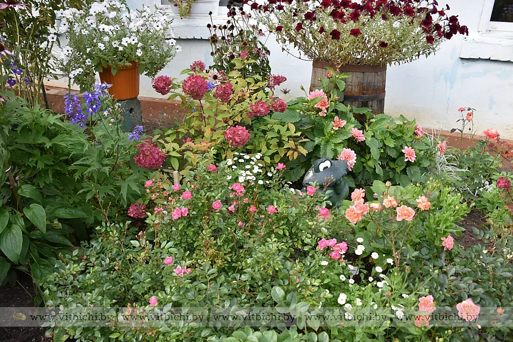 Рассказывая о своем хобби, Мария Нарожная отмечает, что год на год не приходится, и это сказывается на растениях. Нынешнее дождливое лето повлияло на жимолость каприфоль, которая в прошлом году цвела дважды, а в этом — цветов практически не дала. Зато выросли на диво эустомы — любимые ирландские розы дочери Нарожных Ирины. Порадовали также примулы, петунии, садовый ландыш, волжанка, шиловидный флокс и лаванда. До сих пор еще цветет колокольчик Пржевальского. Все эти растения абсолютно не мешают друг другу, а наоборот — одни защищают других от излишнего солнца и ветра. В общем, удачно соседствуют. Такая же идиллия царит и у маленького искусственного прудика, в котором летом красовались розовые нимфеи. Марии Ивановне удалось на своем участке гармонично сочетать растения со старинными жерновами, дубовыми бочками, привезенными с малой родины. Но все же особую гордость Марии Нарожной составляют розы. Кустовые, плетистые, чайно-гибридные, почвопокровные… Каждая из них стала настоящим украшением розария. Можно бесконечно любоваться их белыми, розовыми, желтыми, кремовыми, алыми цветами с нежными лепестками и вдыхать их волшебный аромат. Вот роза Карнавал, каждый бутон которой отличается по цвету. А здесь притаилась Первая леди. Она устойчива к морозам, но жутко боится обильных осадков. Бутоны ее могут быть как одиночными, так и в соцветиях. Рядом красуются розы японских сортов — более устойчивых к природным сюрпризам и болезням.