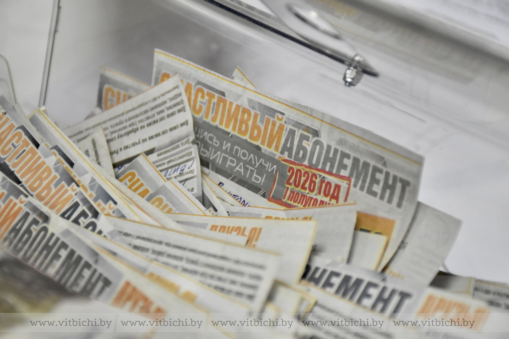 Городская газета «Витьбичи» провела розыгрыш призов рекламной игры «Счастливый абонемент» в Доме прессы на улице Гоголя, 17. Всего в редакцию поступило 596 купонов от подписчиков, между ними были разыграны 85 ценных призов: аэрогриль, мультиварка, вафельницы, наборы противней, электрочайники, паровая швабра, утюги и многое другое.