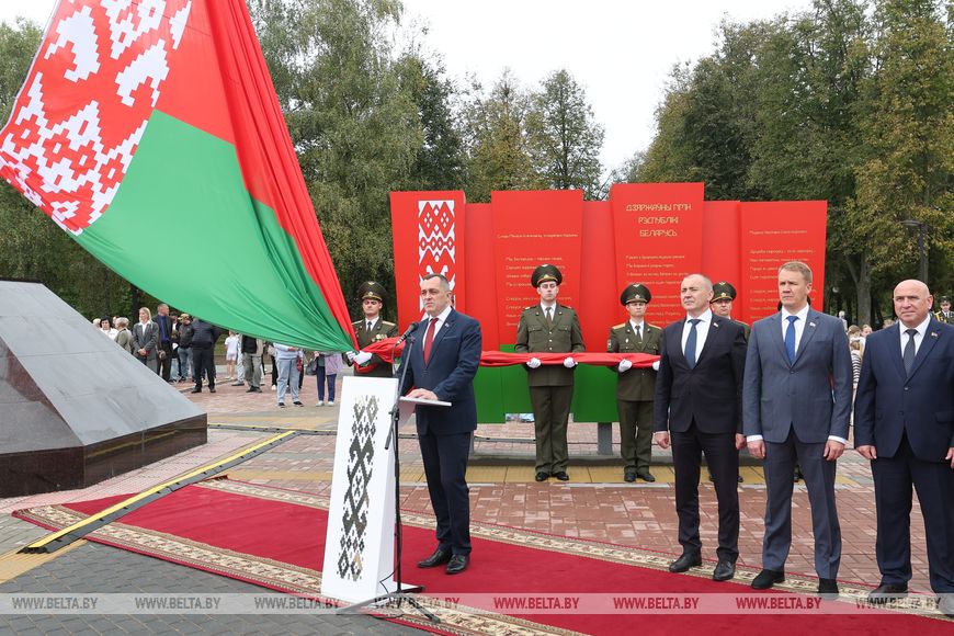 "Государственный флаг - воплощение суверенитета и независимости нашей страны. В его красках - сила и мужество нашего народа, чистота помыслов и мирное устремление белорусов, плодородие и щедрость нашей земли. А в орнаменте флага, автором которого является уроженка Сенненского района Матрена Маркевич, заложены традиции Витебщины", - сказал председатель Витебского облисполкома Александр Субботин.