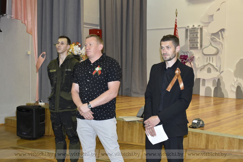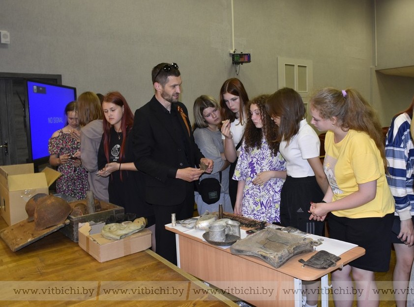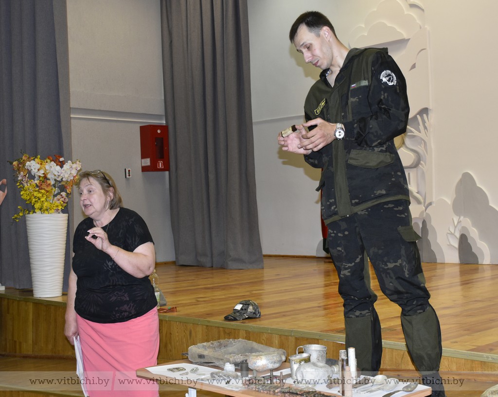 Член отряда «Северные волки» Виталий Грунтов рассказал учащимся о том, какие тяжелые бои по освобождению российского города Невеля, белорусских Городка и Витебска шли на нашей земле. «Северные волки» занимаются поиском останков погибших бойцов Красной армии, их солдатских медальонов и других личных вещей на территории Российской Федерации. То, что находят неравнодушные молодые люди, и было представлено во время встречи на выставке: тронутые временем каски советских бойцов и немецких солдат, предметы воинского снаряжения.