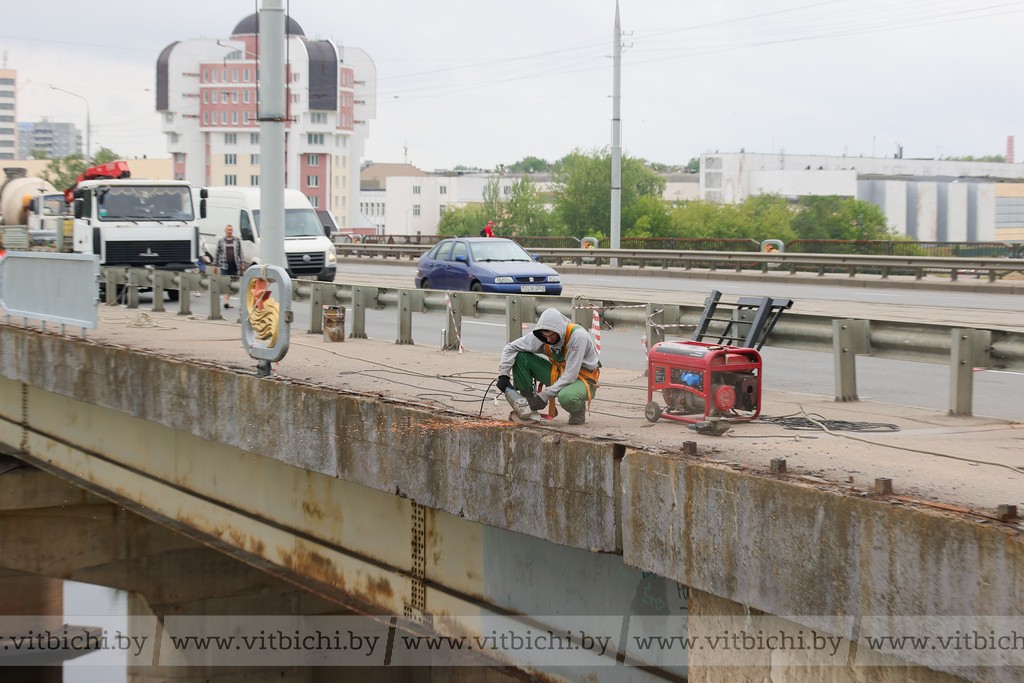 Работники государственного предприятия «Гордормост» снимают старые и устанавливают новые оцинкованные перила на мосту Блохина. Красят перила, устанавливают барьерные ограждения на мостах Юбилейном, Шмырёва, Кировском.