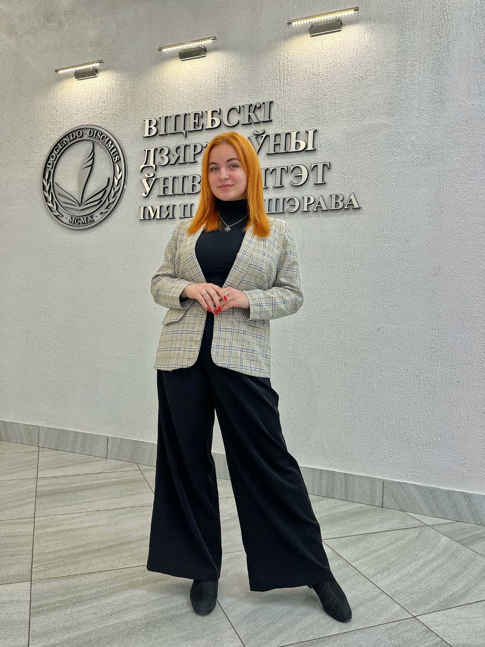 Каролина Якубова - студентка 3-го курса факультета экономики и бизнес-управления, лауреат и призер международных конкурсов и фестивалей, победитель творческого цикла и дважды победитель в общем командном зачете Республиканского марафона «Вместе – за сильную и процветающую Беларусь-2021, 2022».