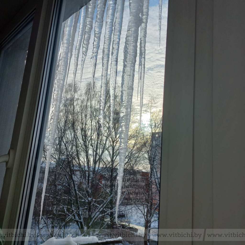 С тех пор, как были сделаны эти снимки снаружи и из окна одной из квартир, прошло больше недели. И сегодня сосульки доросли уже почти до самых перил балконов…