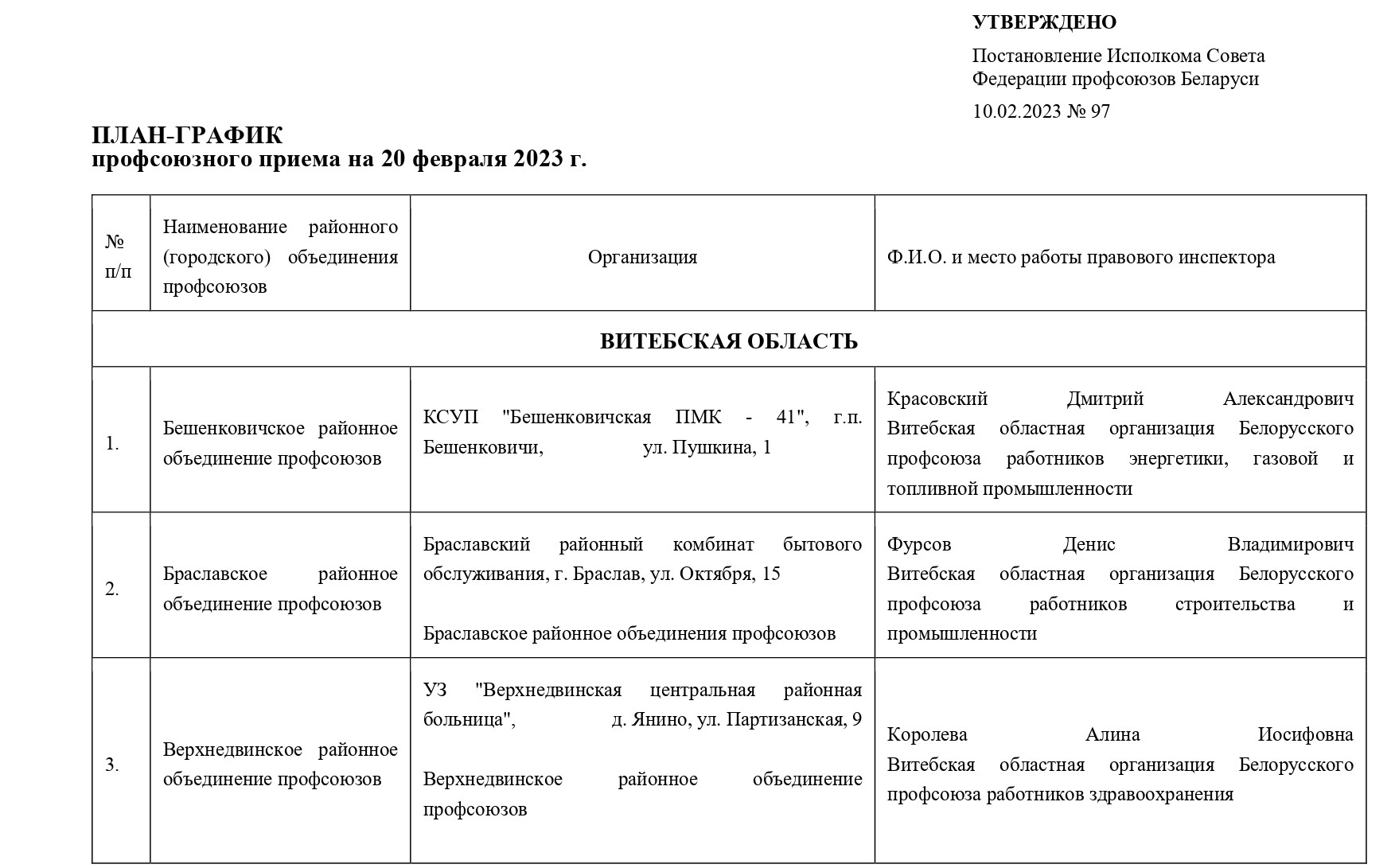 ПЛАН-ГРАФИК ПРОВЕДЕНИЯ РЕСПУБЛИКАНСКОГО ПРАВОВОГО ПРИЕМА В ВИТЕБСКОЙ ОБЛАСТИ