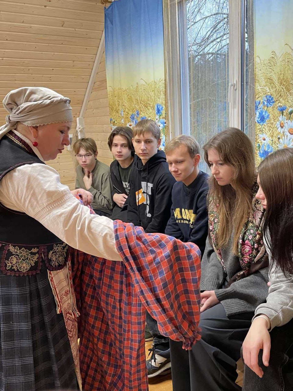 Ребята смогли не только рассмотреть экспонаты ее домашнего этнографического музея, где представлены предметы быта крестьян прошлого и позапрошлого веков, но и научится ими пользоваться. Студенты попробовали прясть пряжу на веретене, утюжить рубелем, стирать белье, используя валёк (небольшой деревянный продолговатый предмет, которым «валяли» или «клепали» на камне или на доске выстиранное белье), а еще станцевали танец с коромыслами.