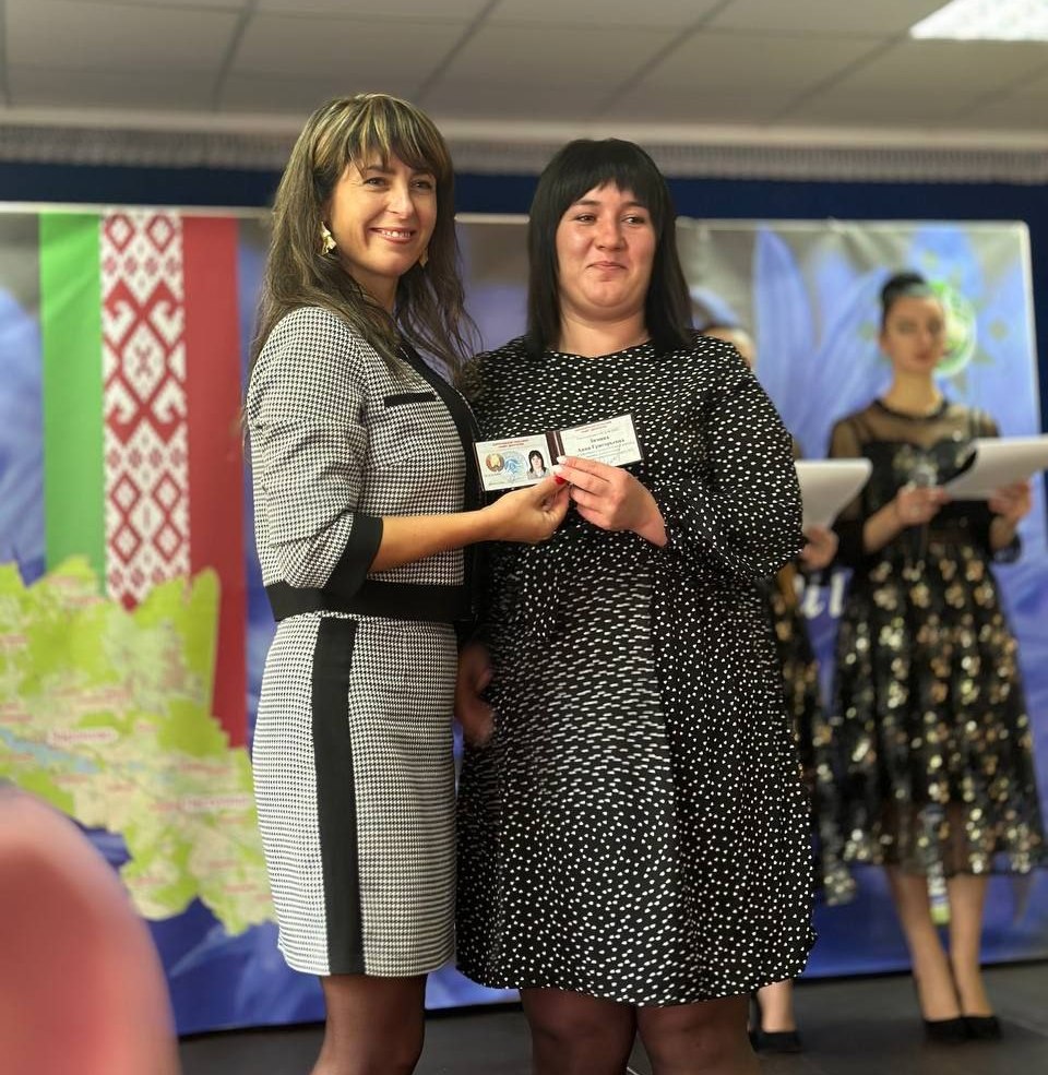 Алеся Синякова вручает Анне Зиминой удостоверение депутата