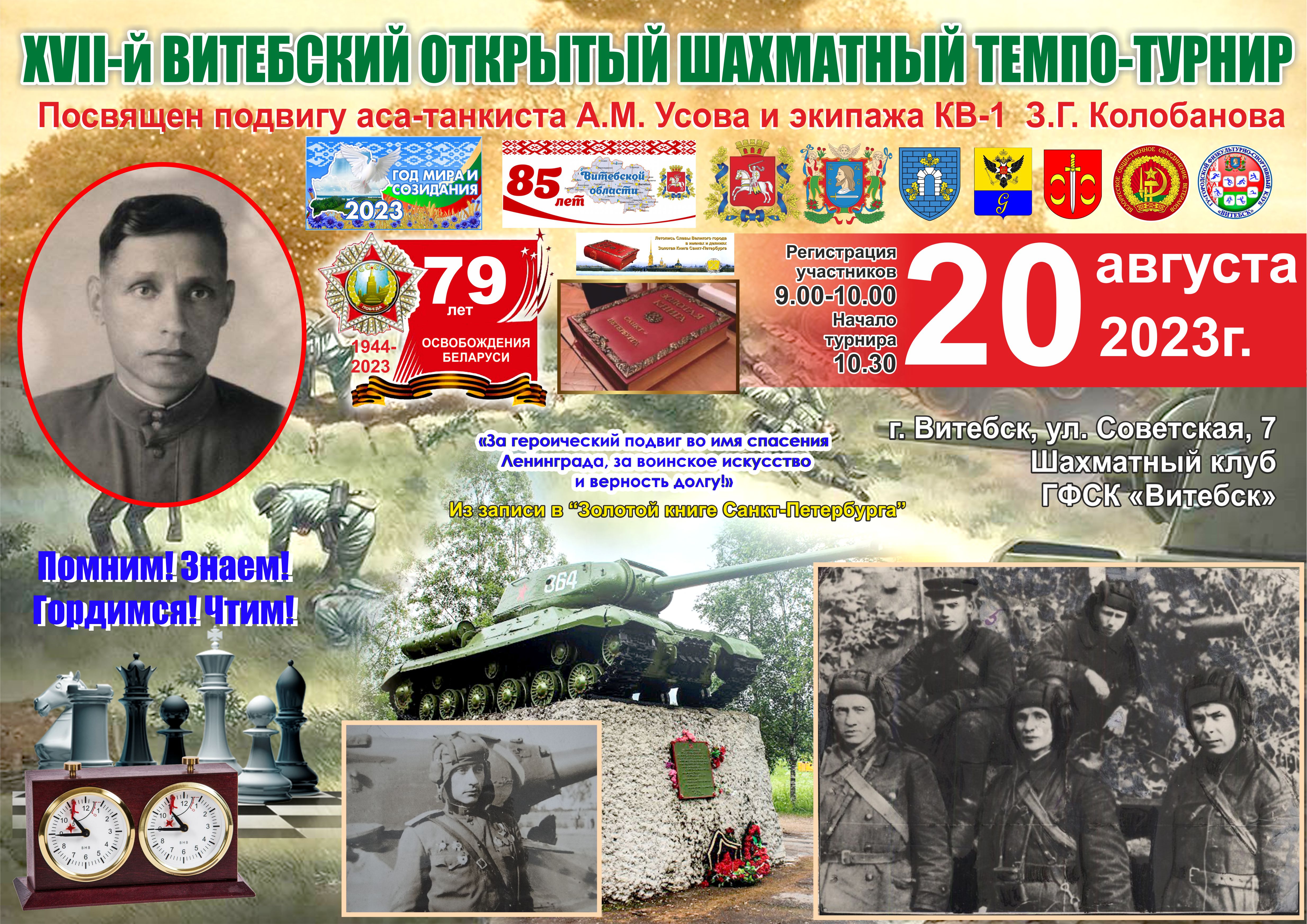 XVII Витебский открытый шахматный темпо-турнир, посвященный уроженцу Дубровенского района танкисту Андрею Усову, пройдет 20 августа в шахматной клубе городского физкультурно-спортивного клуба «Витебск».
