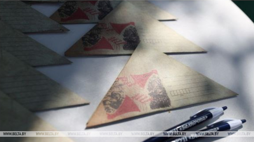 Во время Великой Отечественной войны письма имели форму треугольника, они стали своеобразным символом тех событий. "Известно, что главным средством связи в годы войны была почта. Письма были связующей нитью между тылом и фронтом. Наши почтальоны ежедневно рисковали жизнями, чтобы передать солдатам вести из дома. В то время работа почты не останавливалась ни на минуту. Письмо-треугольник стало одним из символов полевой почты. Ежедневно почтальон вынимал письма от солдат из почтового ящика в воинской части и относил их на военно-почтовую станцию. Здесь на письма проставляли штемпели с датами, складывали в мешки и отправляли на военно-почтовую базу. Там письма сортировались по направлениям и далее передавались на военно-почтовый сортировочный пункт для дальнейшей рассылки по адресам. Письмо из тыла проходило обратный путь и доходило до полевой почтовой станции, откуда почтальон нес его адресату, в том числе и на передовую", - рассказала Светлана Юркевич.
