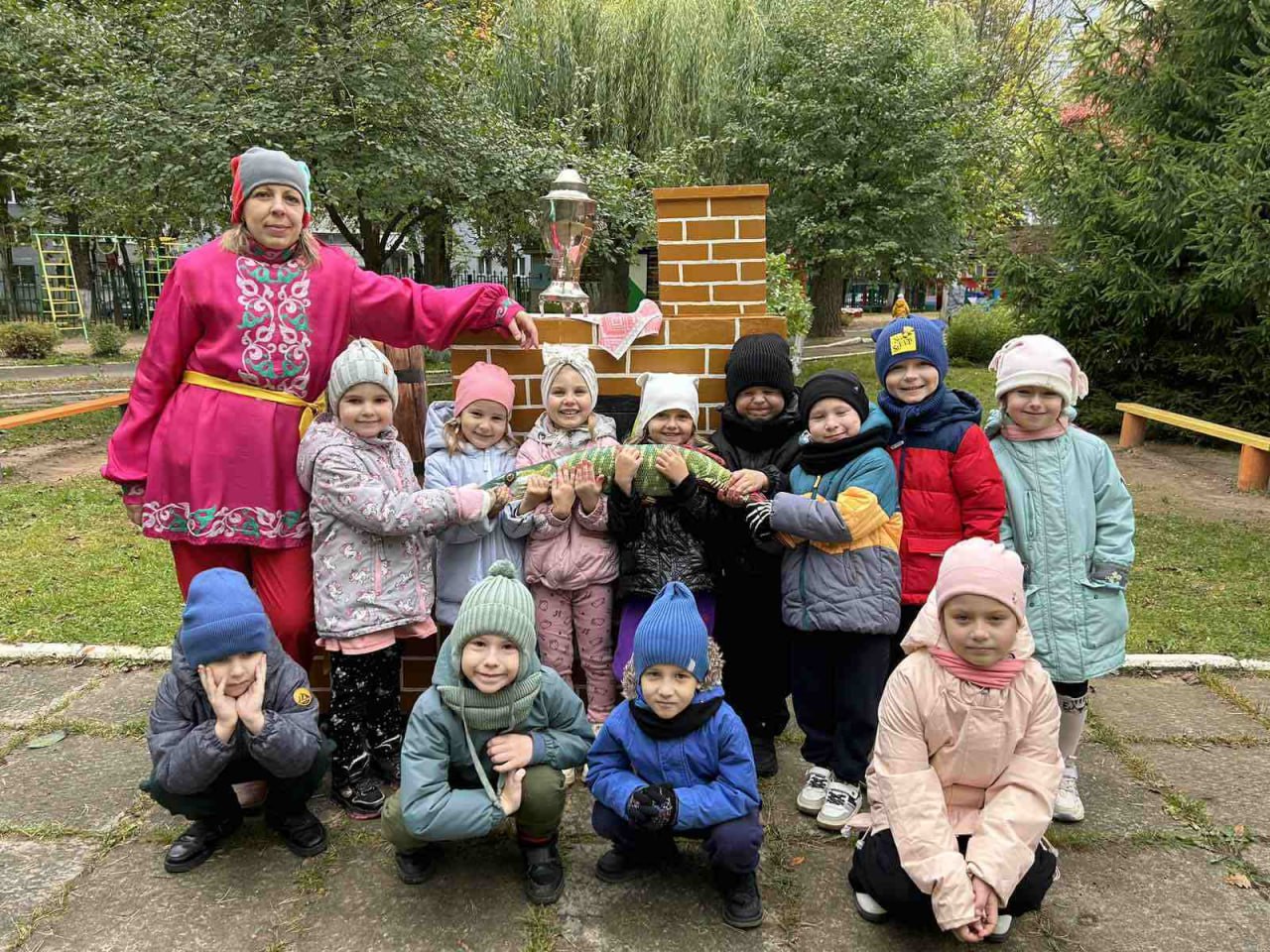 В завершении квеста ребята поспешили к импровизированной фотозоне, где их ждал Емеля на печи и волшебная Щука, исполняющая желания.