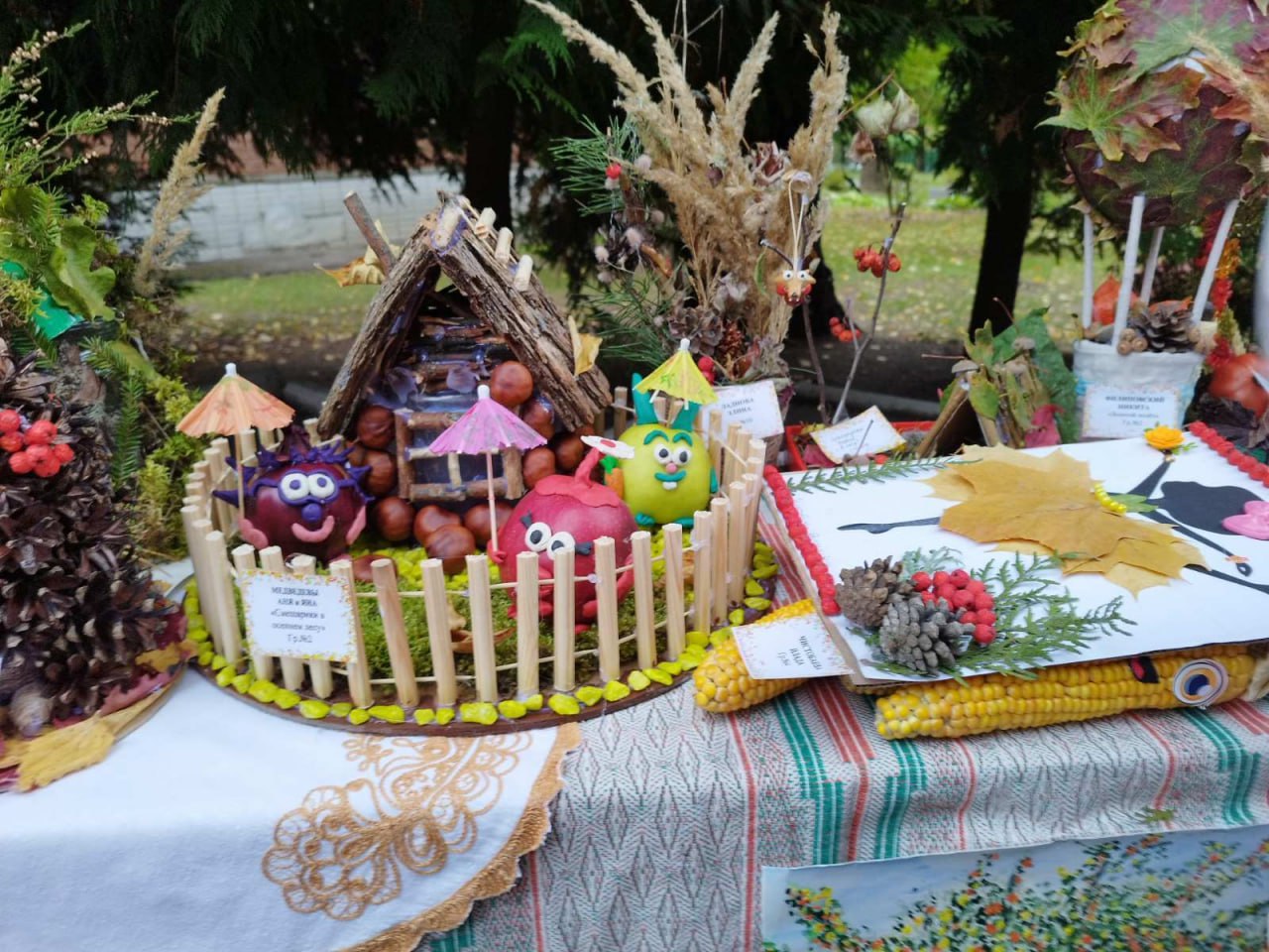 Не менее интересно ребятам было на станции «Богатый урожай», где хозяйка Осень рассказала малышам о тех богатствах, которые дарит нам щедрая белорусская земля, о значении различных обрядов, связанных с завершением жатвы и сбором урожая, и о том, как важно ценить труд людей, выращивающих хлеб. Здесь же была расположена выставка работ, сделанных из даров природы. Чего здесь только не было! Задумчивый ежик в тумане, осенняя мельница, атмосферная избушка на курьих ножках, оркестр из овощей… Фантазии авторов поделок можно было только позавидовать!