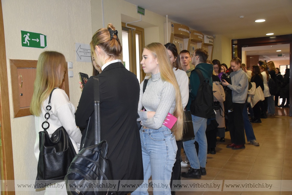 В холле корпуса уже было многолюдно: студенты разных курсов, подготовив паспорта, терпеливо ожидали, когда смогут получить бюллетень и проголосовать за выбранных кандидатов. Молодежь пропускала вперед витебчан. За первый час работы участка проголосовали больше десяти человек.