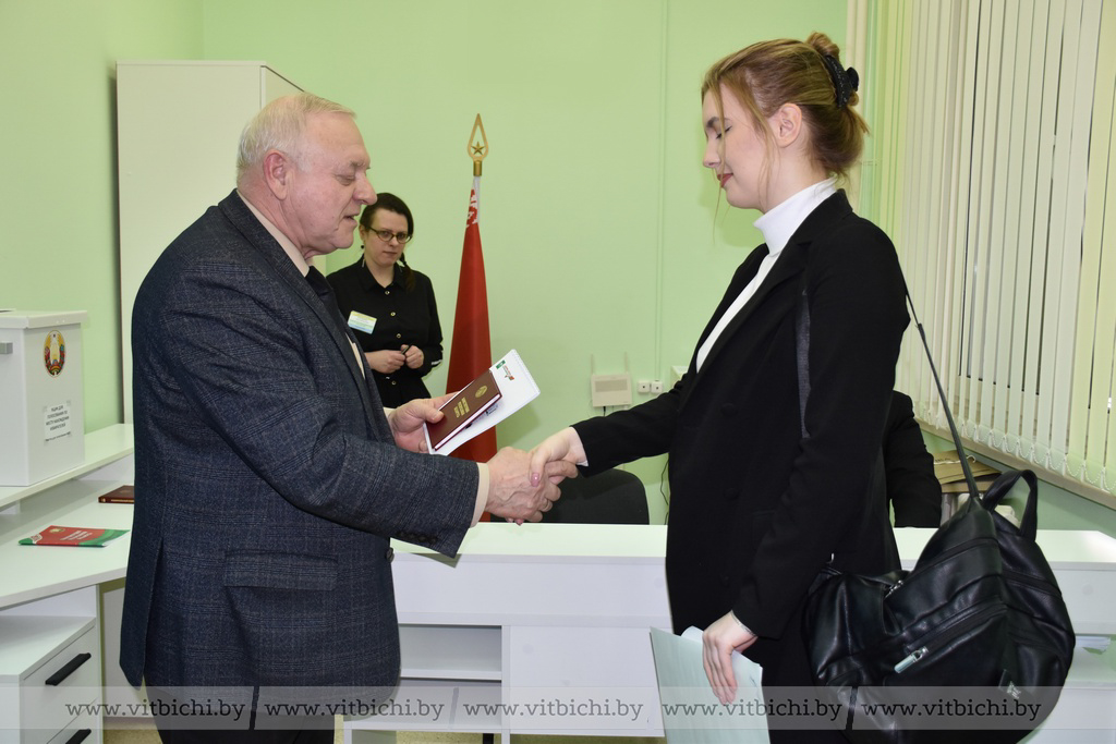 Ректор Витебского государственного медицинского университета Алексей Чуканов тоже присоединился к ответственным студентам и проголосовал на участке № 35. Руководитель медвуза вручил Конституцию Республики Беларусь и фирменный блокнот впервые голосующей студентке второго курса стоматологического факультета Марии Коржовой.