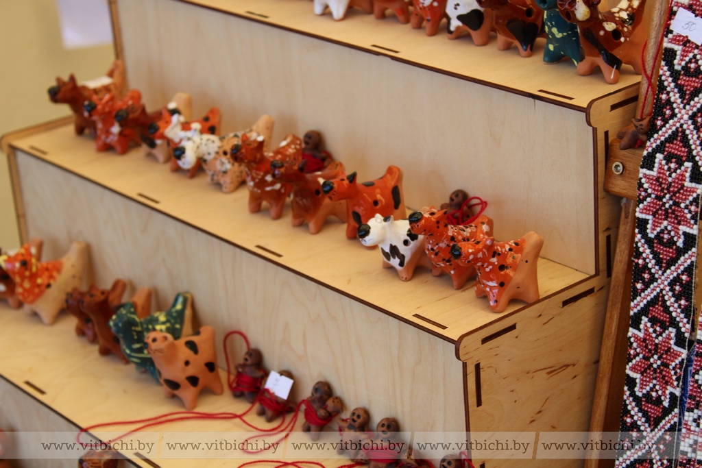 Необычные игрушки-свистульки из керамики реализует на ярмарке центр ремесел «Возрождение» Витебского района. Как рассказала его мастер Алеся Сарбаш, особым спросом у покупателей пользуются разнообразные керамические тарелки, которые можно использовать не только в качестве сувениров, но и по их прямому назначению. Дети не проходят мимо «маляванок», выполненных в том числе и по мотивам творчества белорусского этнографа и фольклориста, уроженца Вымно Николая Никифоровского. Из последних новинок центра ремесел – галстуки из бисера. Плетение таких необычных аксессуаров с использованием мотивов традиционных для Витебского района орнаментов освоила мастер по ткачеству Александра Хайсова. Каждый узор имеет определенный смысл и может принести обладателю галстука то, чего ему так не хватает в повседневной жизни, – любовь, удачу, благополучие, силу. На изготовление одного тонкого галстука у мастерицы уходит от двух недель, на тех, что шире, – почти месяц и порядка 350–400 граммов бисера. Работа сложная, кропотливая, требует усидчивости и ловкости. Иногда на сортировку бисера времени тратиться больше, нежели на само плетение. Также мастерица научилась изготавливать очелье – головной убор из бисера для женщин, его также можно примерить и приобрести.