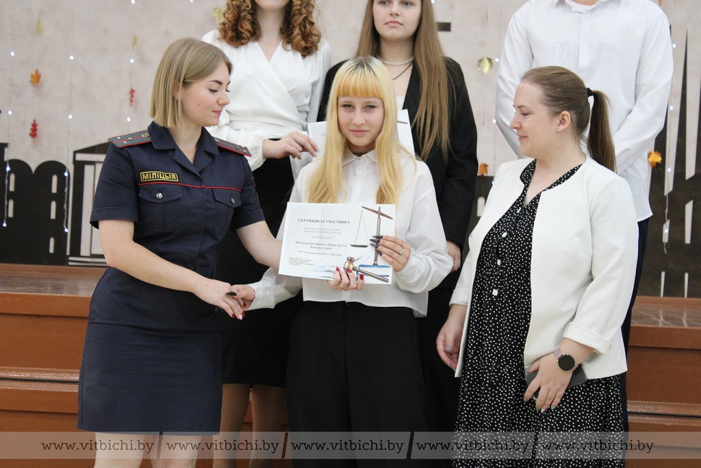 Заместитель председателя комиссии по делам несовершеннолетних администрации Октябрьского района Александра Александрёнок поблагодарила всех за участие в районном проекте «Правовая мастерская». Она рассказала, что летом ребята разрабатывали и представляли видеоролики о государственных символах страны, трудовом, гражданском и семейном законодательстве. Александра Александрёнок и участковый инспектор инспекции по делам по делам несовершеннолетних отдела внутренних дел администрации района Юлия Маркевич вручили грамоты, благодарности и ценные подарки авторам самых креативных видеоработ, профилактических брошюр и плакатов.