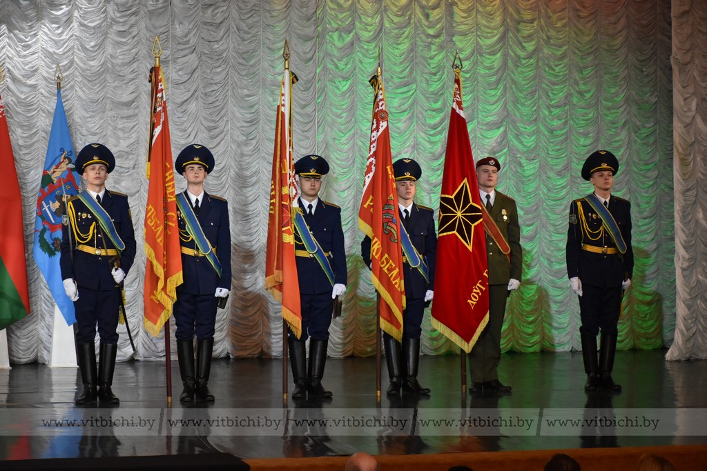 В зал торжественно внесли боевые знамена 103-й Витебской отдельной гвардейской Краснознаменной ордена Ленина, ордена Кутузова II степени воздушно-десантной бригады имени 60-летия СССР, 7-й отдельной специальной милицейской бригады внутренних войск Министерства внутренних дел Республики Беларусь.