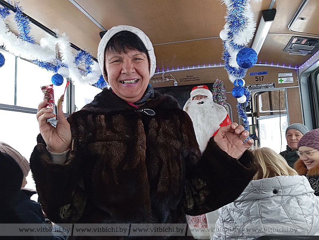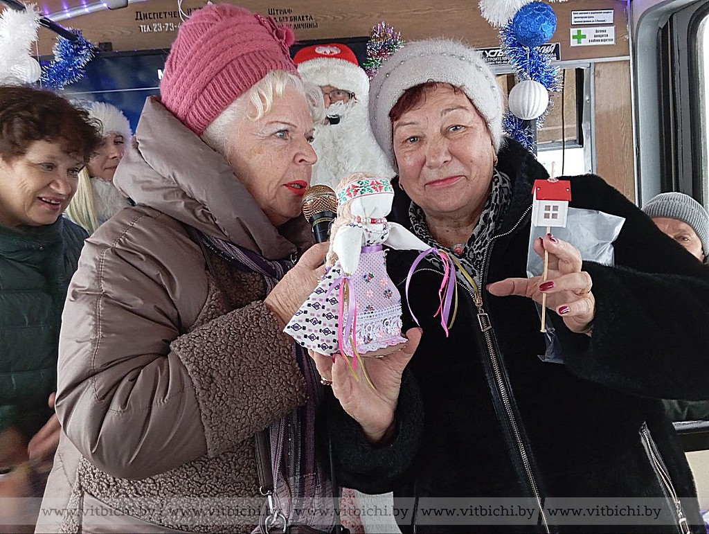 Поездка оказалась с сюрпризом ещё и потому, что на одной из остановок в салон вошли Дед Мороз со Снегурочкой. Главные персонажи Нового года были встречены на ура. К тому же Дед Мороз, что называется, завёл публику. Женщины живо реагировали на загадки, читали стихи и дружно пели новогодние песни. Не обошлось без подарков, которыми стали наборы конфет (очередной сюрприз от городской организации БСЖ) и куклы-обереги от мастериц-членов первички.