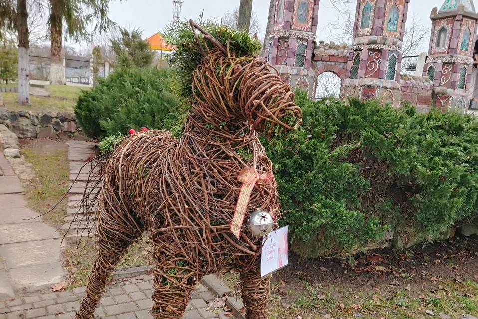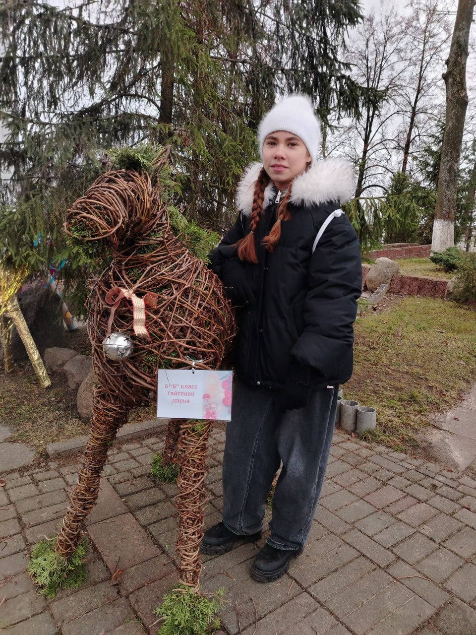 Сказочную лошадку, символ наступающего 2026 года, изготовила из веток и другого природного материала учащаяся 6 класса этого учреждения образования Дарья Гайсёнок вместе с родителями.