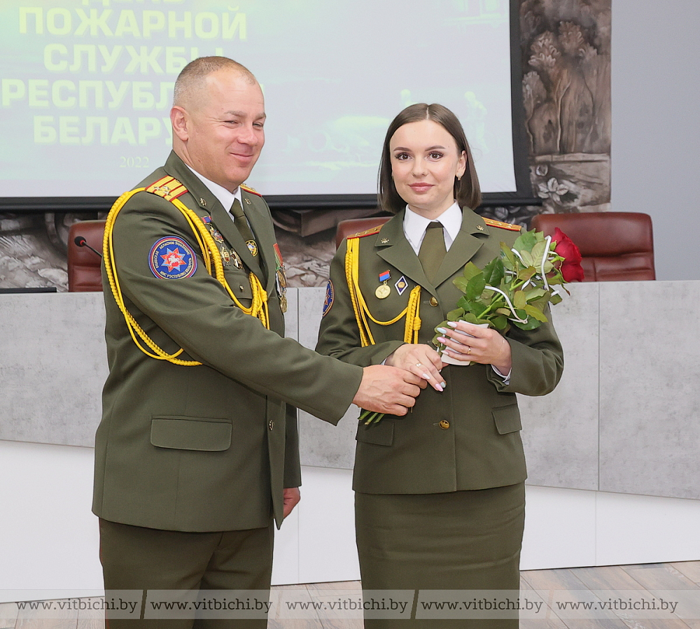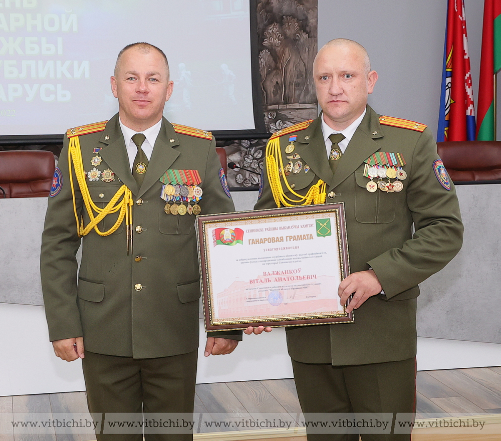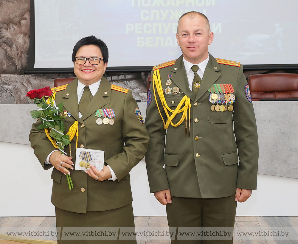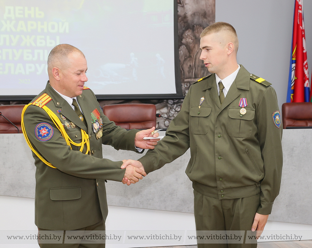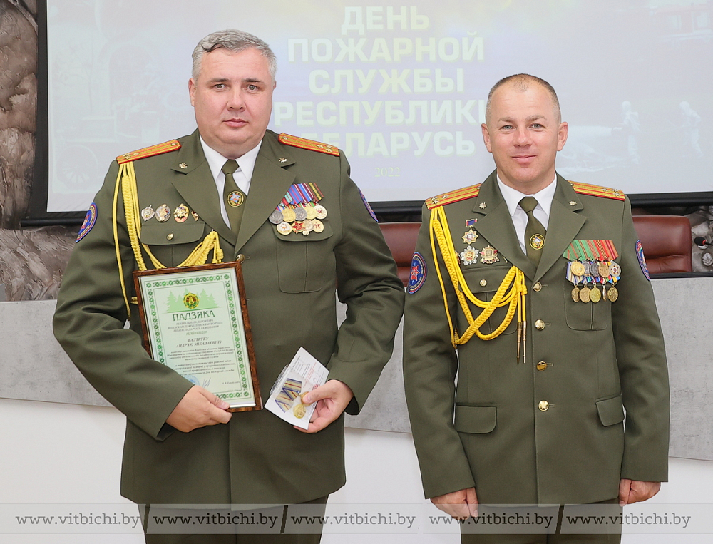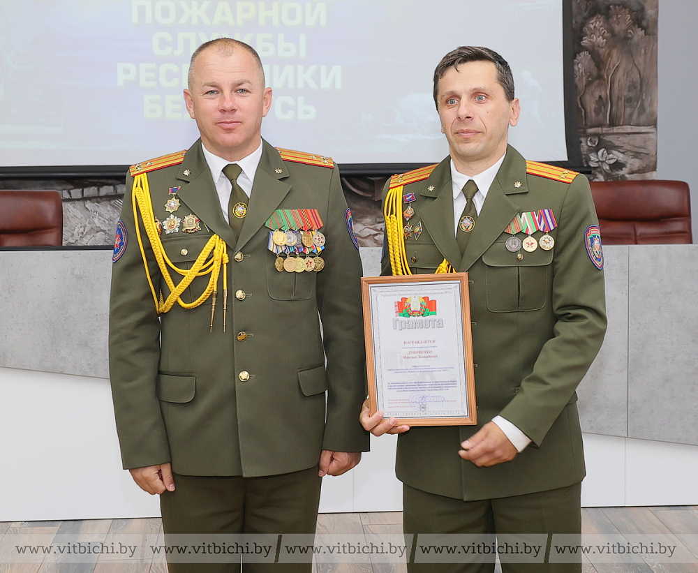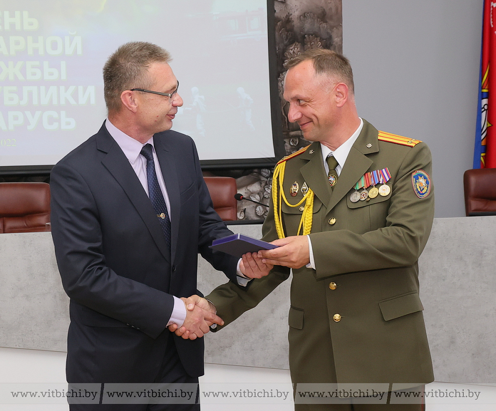 Затем Сергей Мелешкин наградил ряд сотрудников Почетными грамотами, нагрудным знаком «165 год пожарной службы» и юбилейными медалями «75 год Перамогі ў Вялікай Айчыннай вайне 1941-1945 гадоў», погоны подполковника внутренней службы вручены майору Алексею Петроченко.
