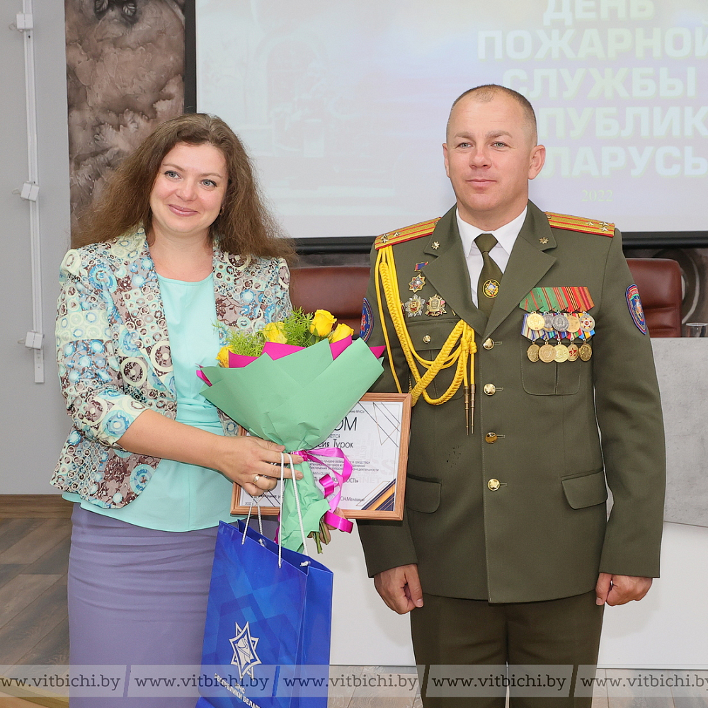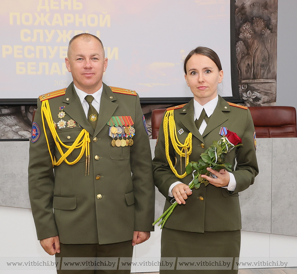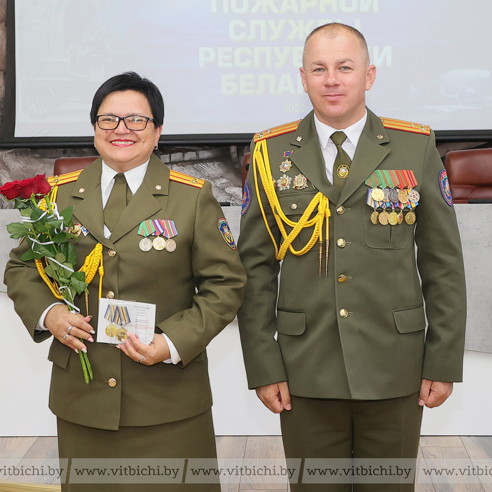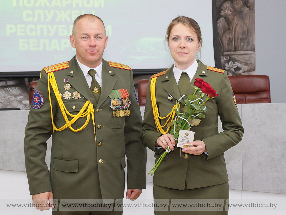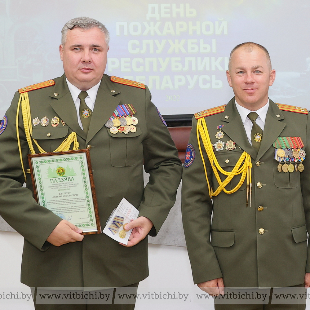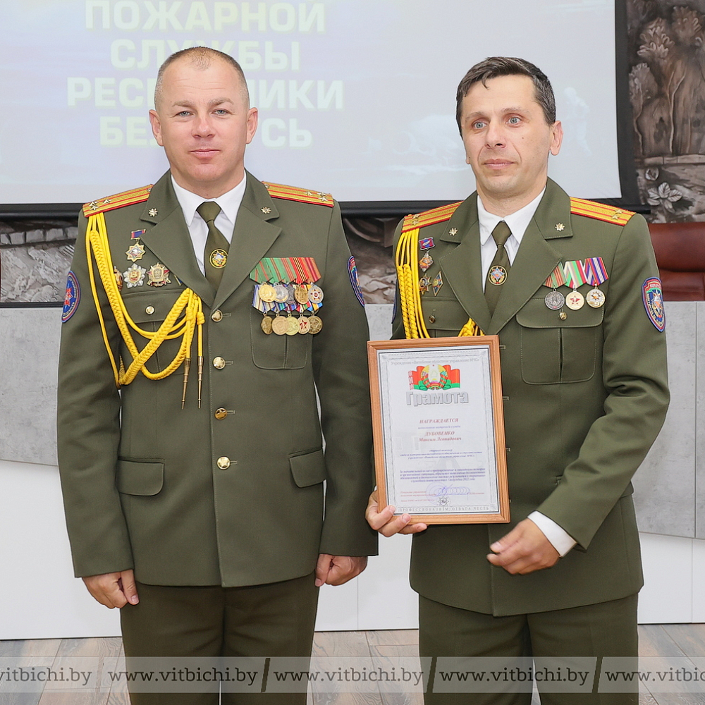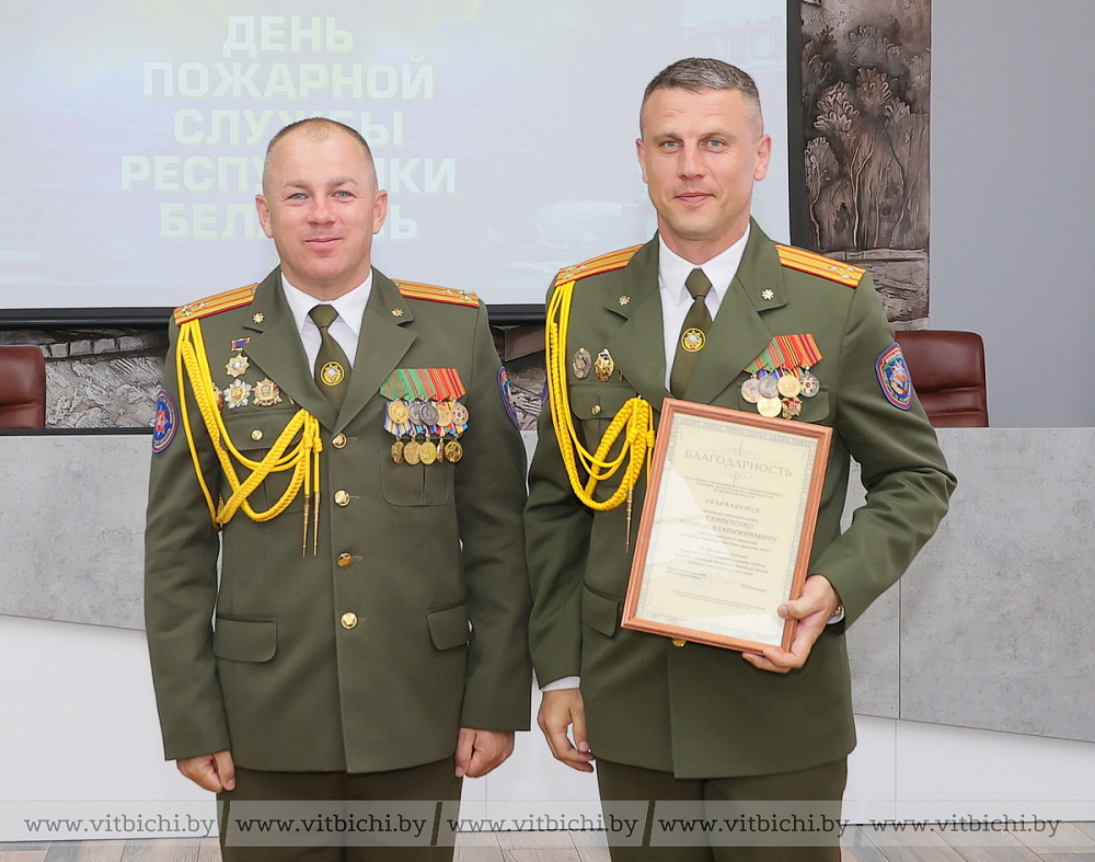 Затем Сергей Мелешкин наградил ряд сотрудников Почетными грамотами, нагрудным знаком «165 год пожарной службы» и юбилейными медалями «75 год Перамогі ў Вялікай Айчыннай вайне 1941-1945 гадоў», погоны подполковника внутренней службы вручены майору Алексею Петроченко.