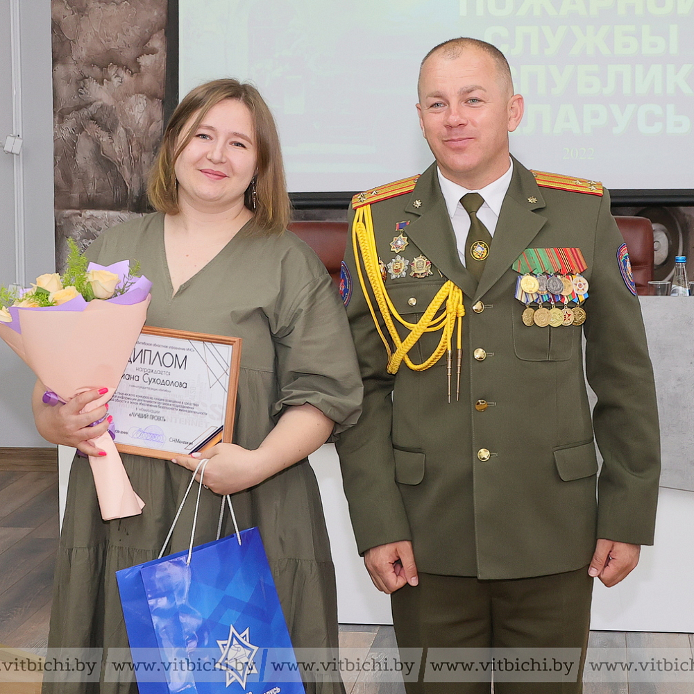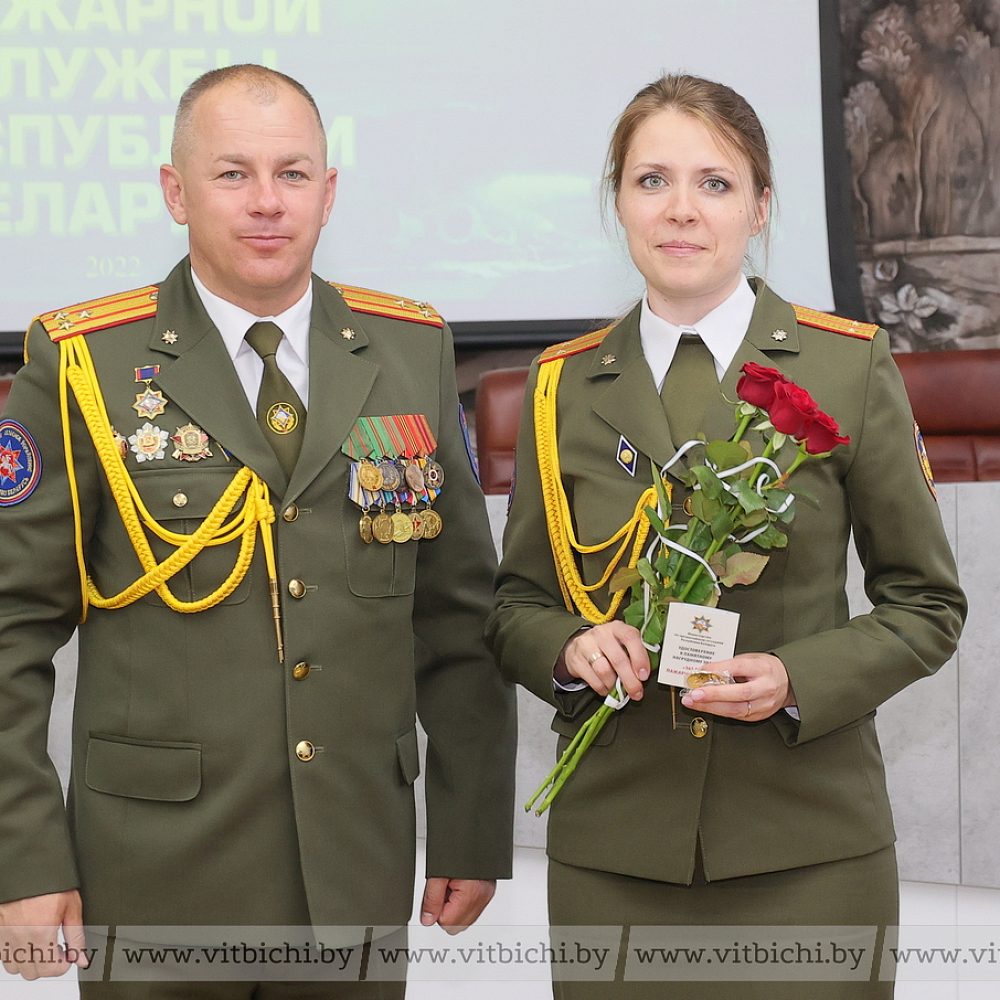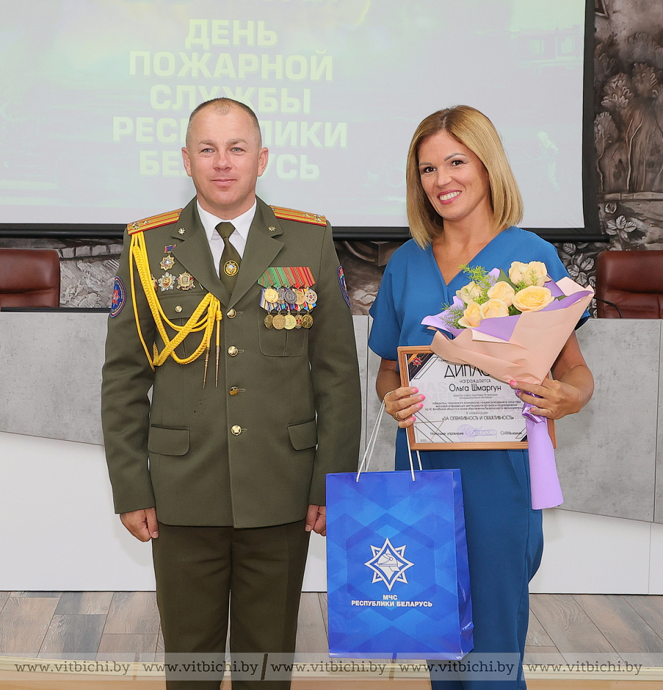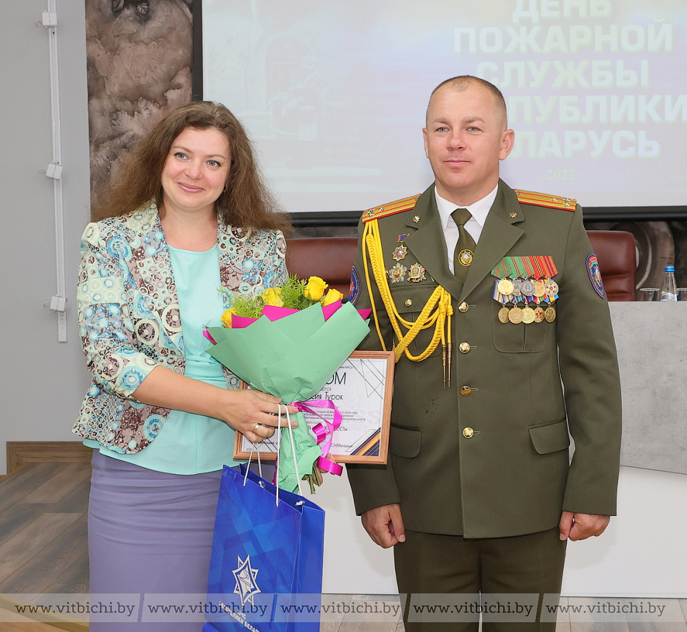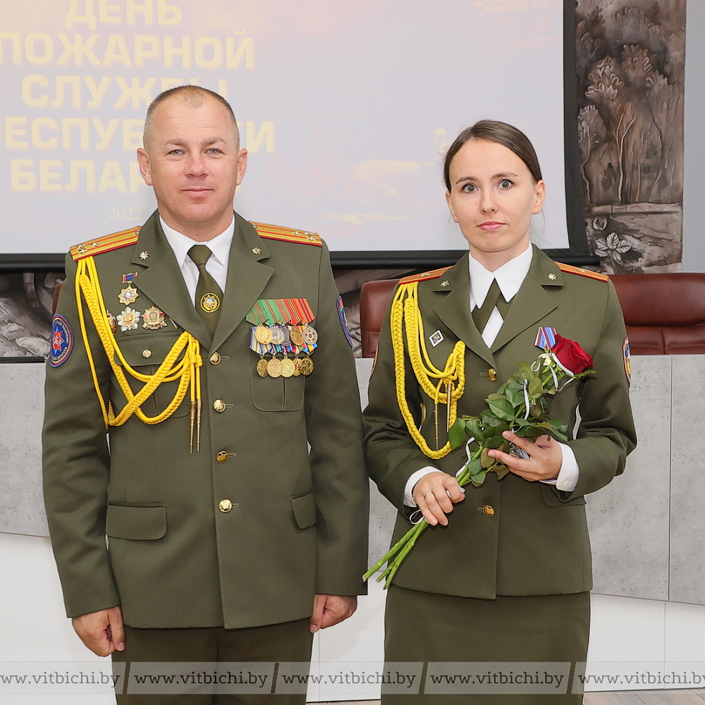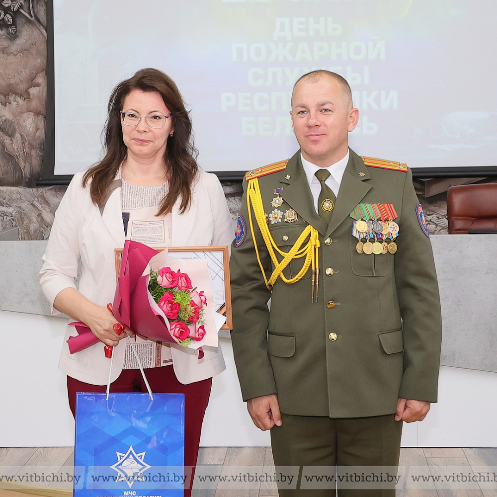 Затем Сергей Мелешкин наградил ряд сотрудников Почетными грамотами, нагрудным знаком «165 год пожарной службы» и юбилейными медалями «75 год Перамогі ў Вялікай Айчыннай вайне 1941-1945 гадоў», погоны подполковника внутренней службы вручены майору Алексею Петроченко.