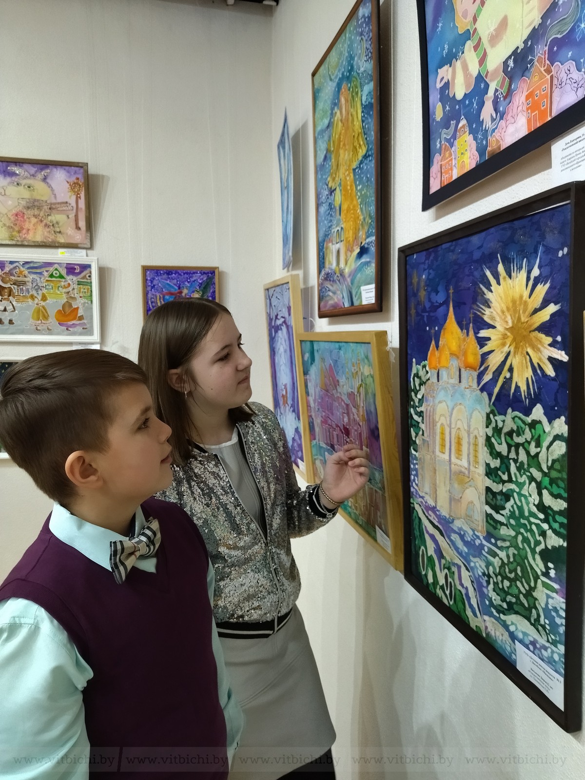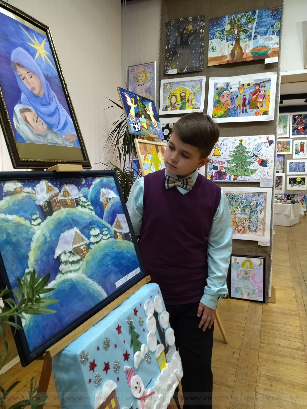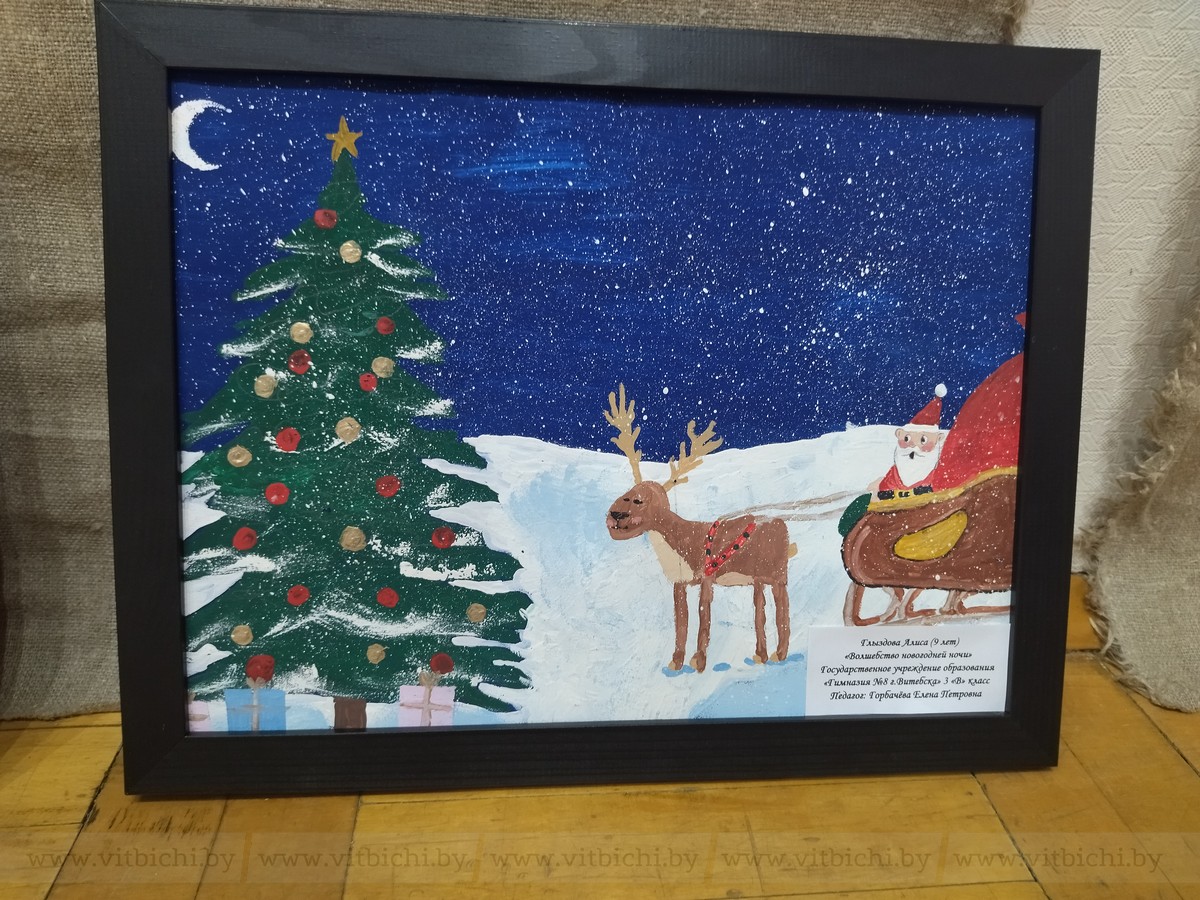 Уже 13 лет конкурсная выставка экспонируется в ДШИ № 3 «Маладик». Здесь сейчас размещены почти все конкурсные работы, сколько вместили залы. Это живопись, графика, предметы декоративно-прикладного творчества. Участники выставки — ребята от 8 до 17 лет. Каждый из них создал свой сюжет, свои образы Рождества, дал возможность зрителю почувствовать настроение праздника и его особенность, рассказал о семейных традициях…