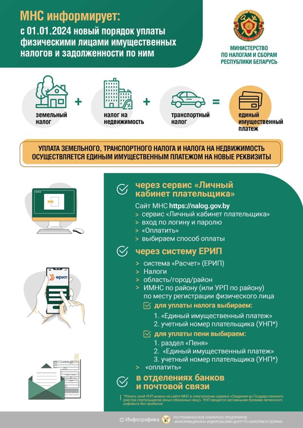 Также информация о суммах единого имущественного платежа размещена в ЕРИП. Кроме того, до 1 октября будут направлены по почте извещения на уплату единого имущественного платежа.