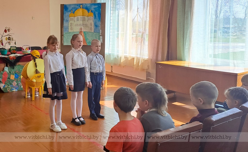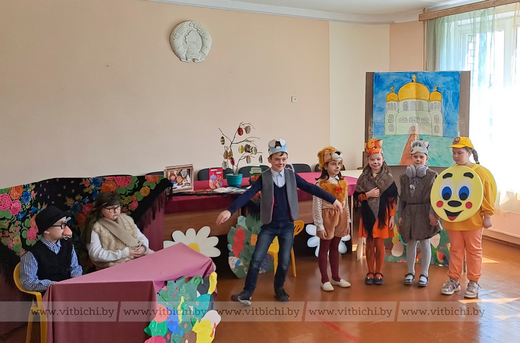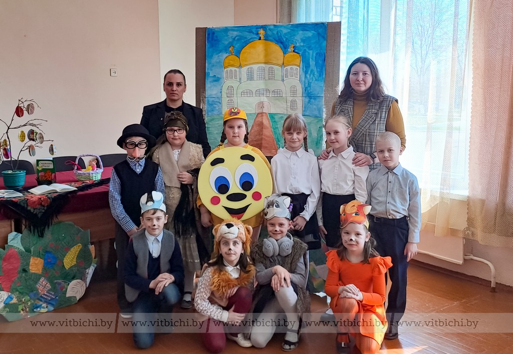 Под руководством воспитателя группы продленного дня Инги Перемотовой и заведующей библиотекой Яны Молчановой ребята подготовили театральную постановку «Пасхальный колобок». На сцене разыгралось целое представление с участием сказочных героев: Колобка, Лисы, Волка, Зайца, Мишки, Бабки с Дедкой. Действие сопровождалось замечательно подобранными музыкальными вставками. А декорации учащиеся смастерили самостоятельно.