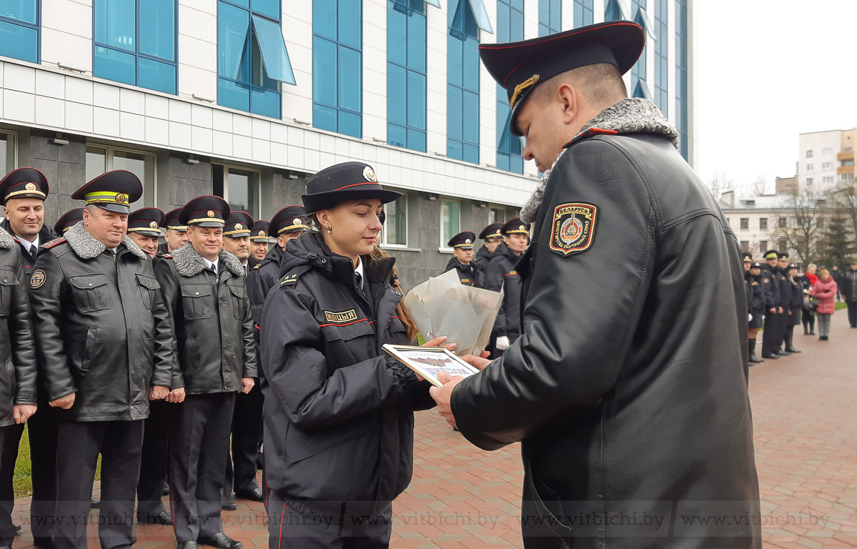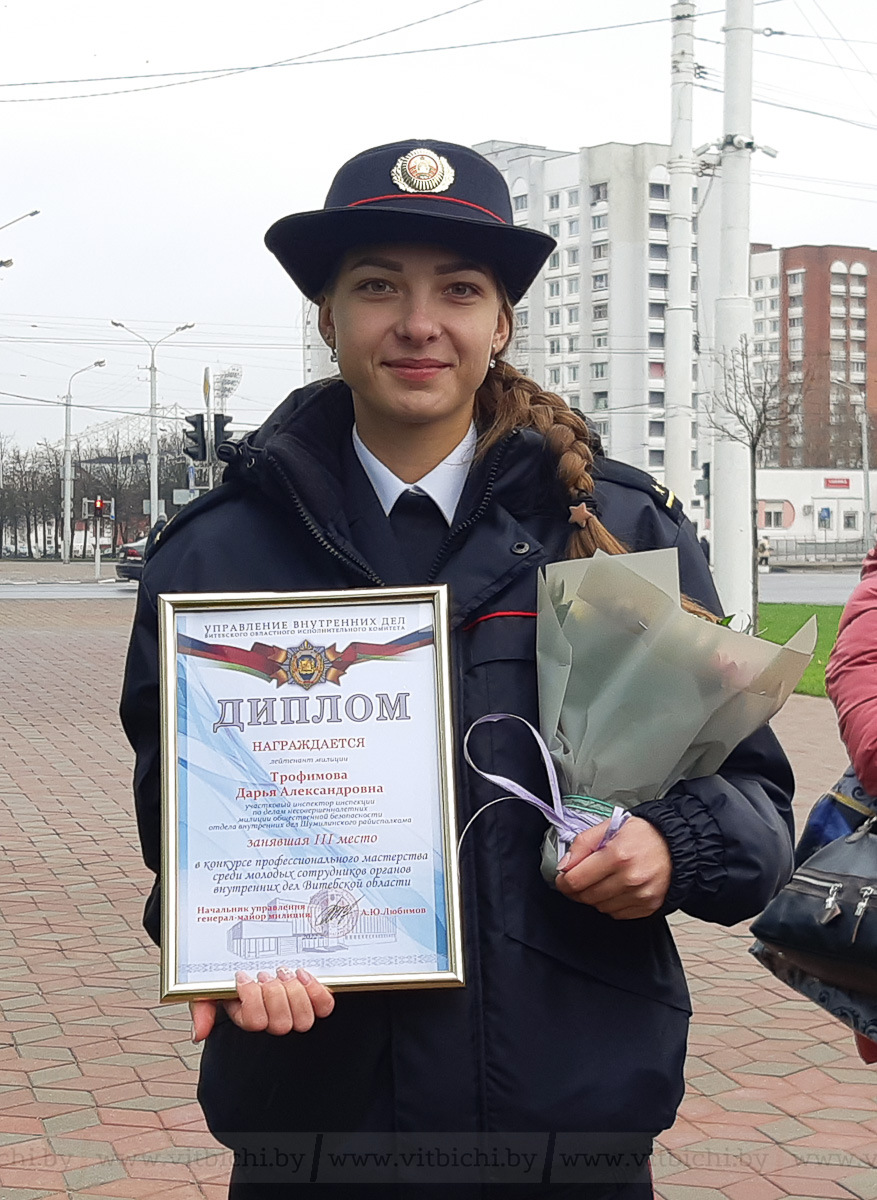 Заместитель начальника УВД Алексей Шахович наградил дипломами победителей конкурса профессионального мастерства молодых сотрудников и лучших в боевой и физической подготовке. Среди них были две девушки. Например, Дарья Трофимова - инспектор ИДН из Шумилино - заняла третье место в конкурсе профессионального мастерства среди молодых сотрудников, хотя служит всего 8 месяцев. Ее супруг Александр работает в милиции. Он также становился победителем конкурса областного и республиканского уровней.