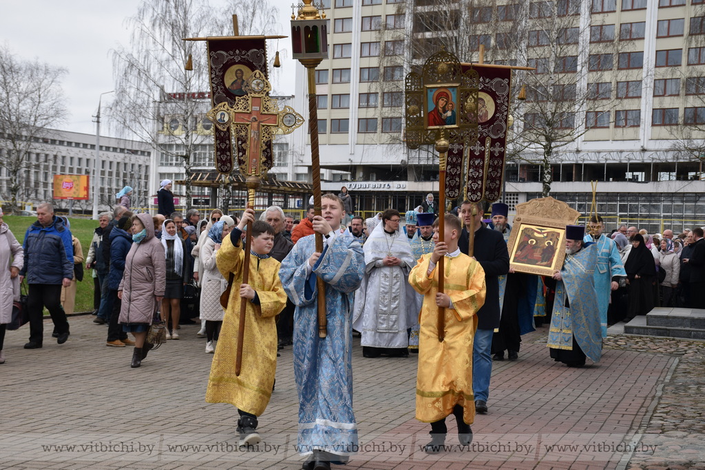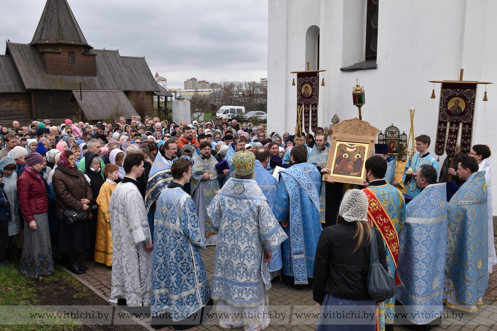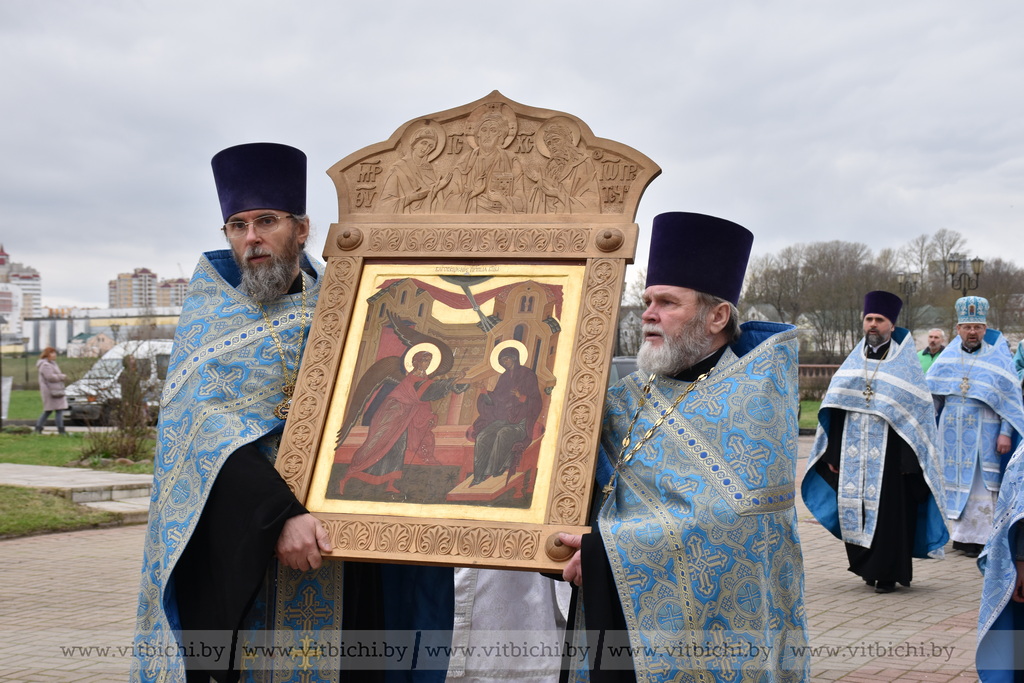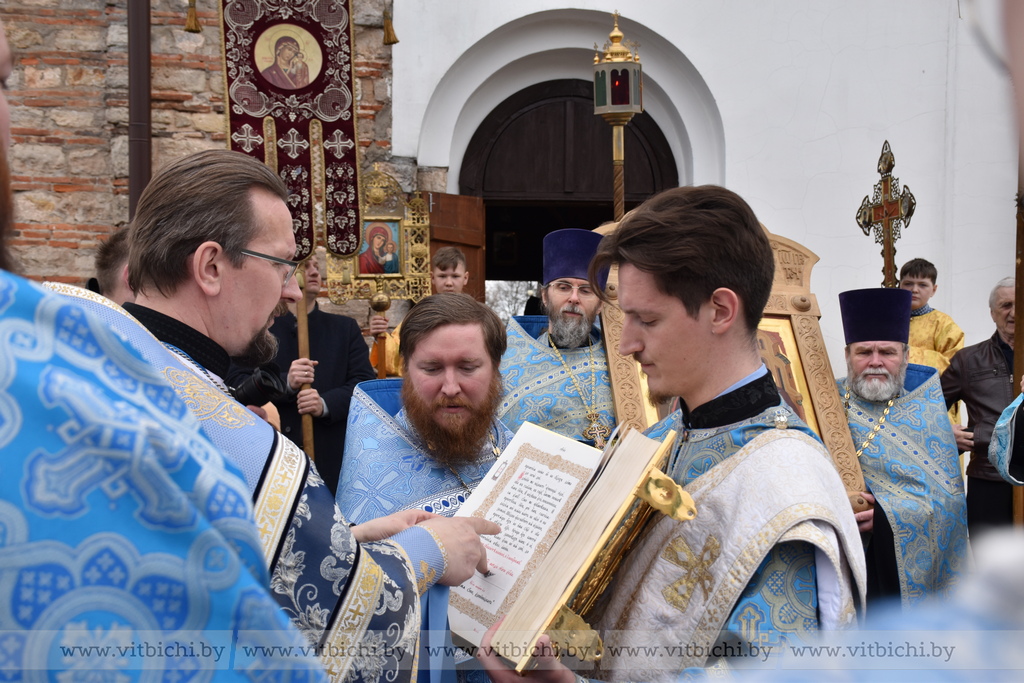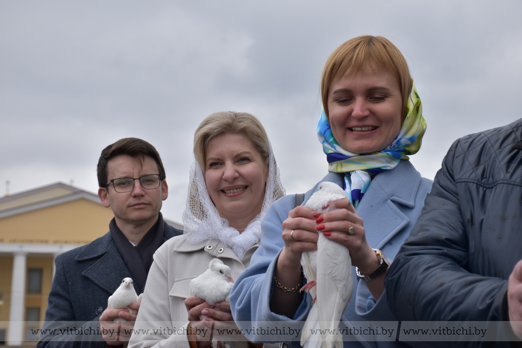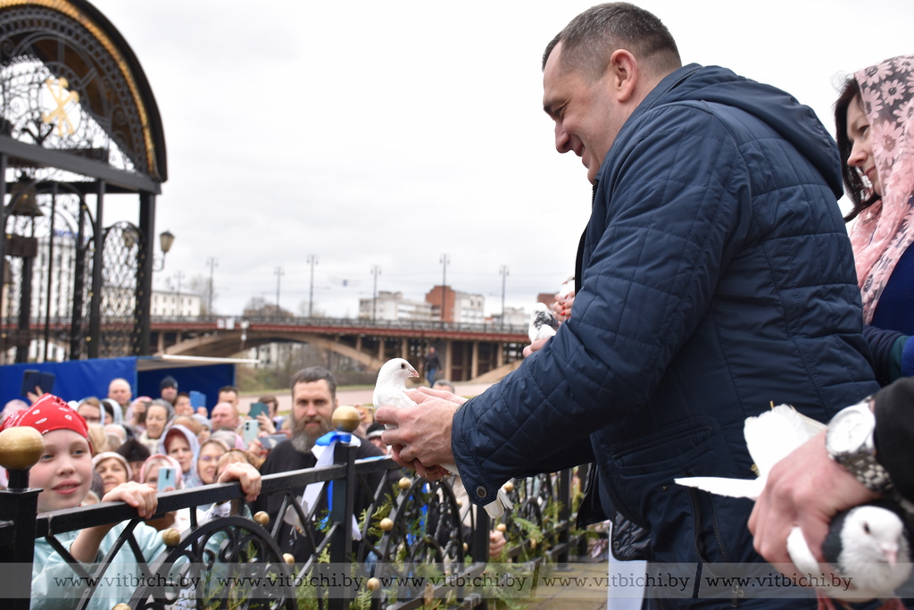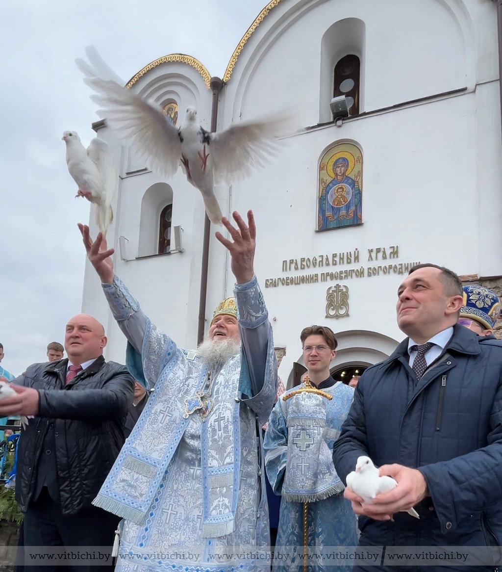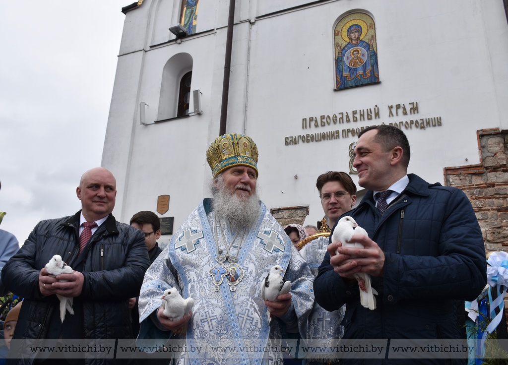Со ступеней Благовещенского храма представители духовенства во главе с архиепископом Витебским и Оршанским Димитрием, а также председатель Витебского облисполкома Александр Субботин и председатель Витебского областного Совета депутатов Дмитрий Демидов под восхищенные возгласы всех собравшихся на праздник выпустили в небо белых голубей.