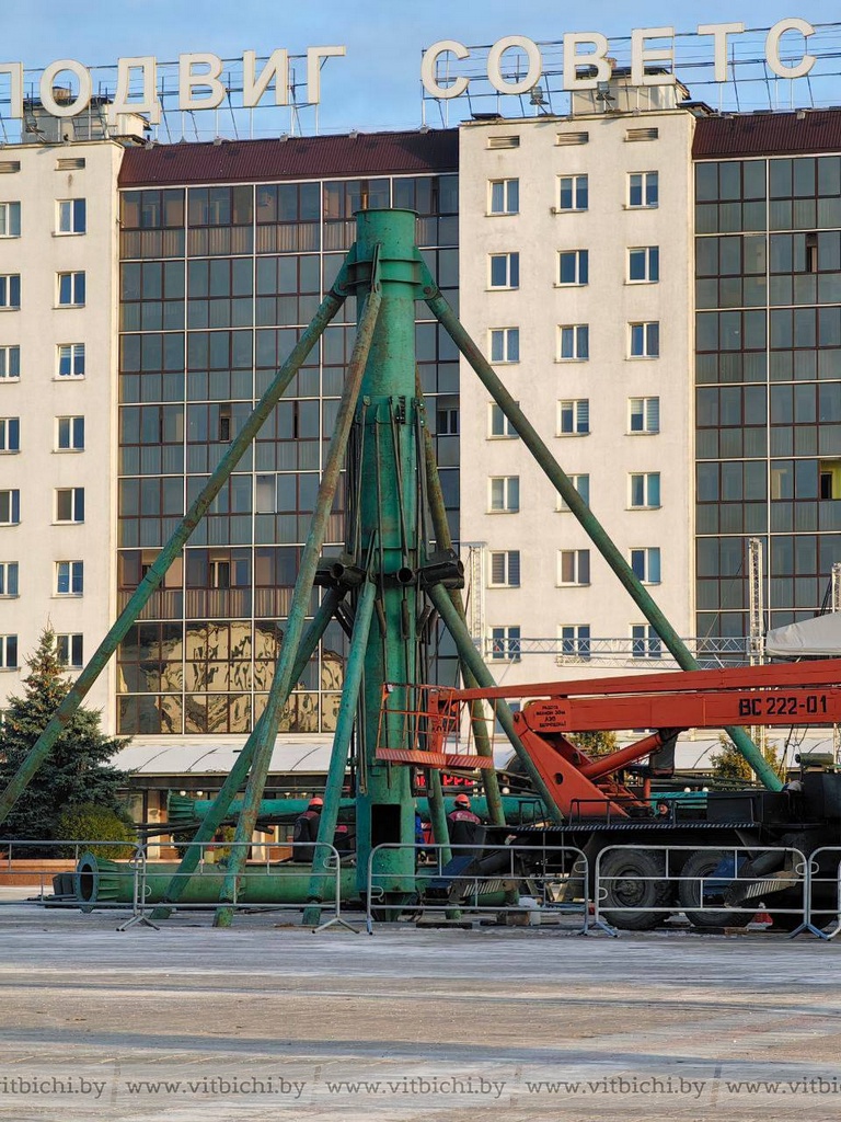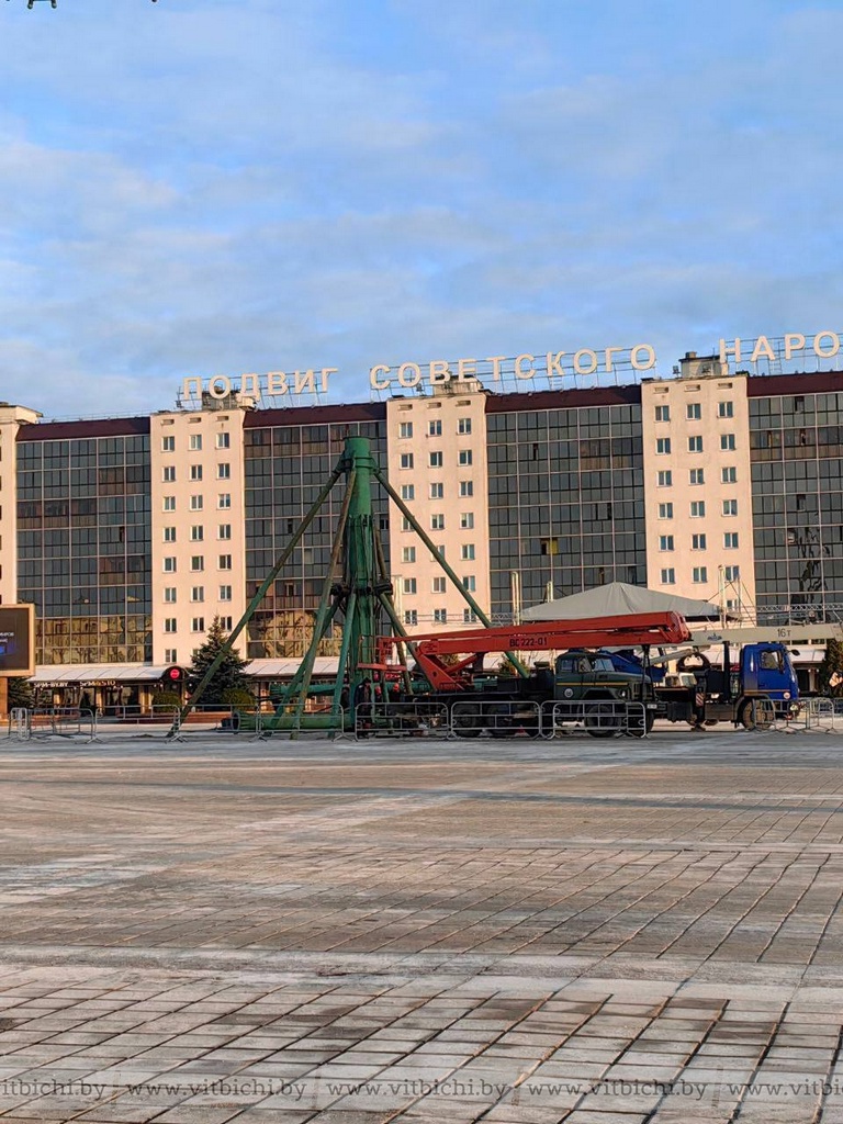 На Площади Победы началась установка главной новогодней елки области. Чтобы она выглядела «с иголочки», постараются разные службы – Витебское предприятие котельных и тепловых сетей, «Витебский Зеленстрой», «Горсвет».